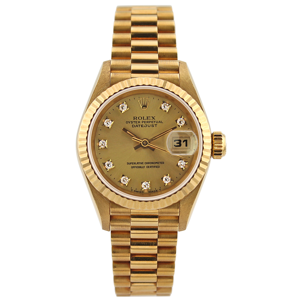 This Rolex Datejust Lady 69178 has a champagne diamond dial and a bracelet strap. This Rolex has undergone a thorough inspection of water resistance, accuracy, functionality and condition to determine the level of reconditioning required to meet our strict standards. It has also been referenced against technical documents and manufacturer records where available to ensure authenticity and a clean history. All our watches have a 24-month warranty for your peace of mind. One of our skilled polishing technicians has removed marks on the case and bracelet of this watch, brought about by daily wear and tear, which is why this watch does not come with the remaining manufacturer’s warranty.