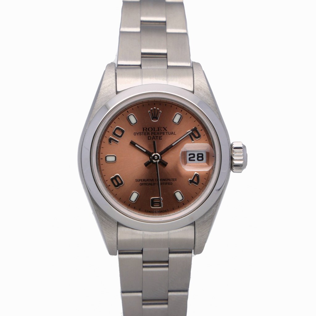 This Rolex Datejust Lady 79160 has a salmon arabic dial and a bracelet strap. This Rolex has undergone a thorough inspection of water resistance, accuracy, functionality and condition to determine the level of reconditioning required to meet our strict standards. It has also been referenced against technical documents and manufacturer records where available to ensure authenticity and a clean history. All our watches have a 24-month warranty for your peace of mind. One of our skilled polishing technicians has removed marks on the case and bracelet of this watch, brought about by daily wear and tear, which is why this watch does not come with the remaining manufacturer’s warranty.