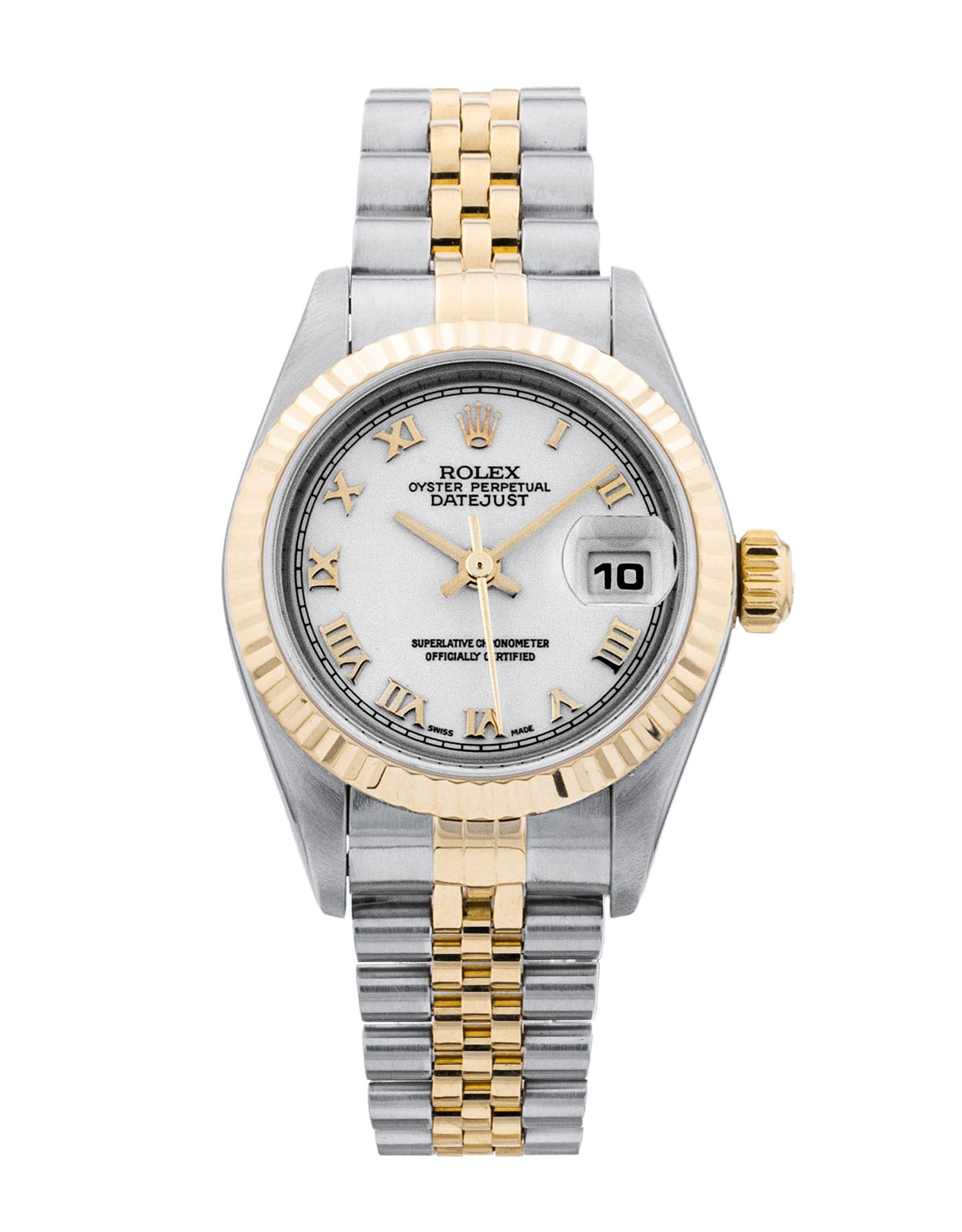 This Rolex Datejust Lady 79173 has a white roman numeral dial and a bracelet strap. This Rolex has undergone a thorough inspection of water resistance, accuracy, functionality and condition to determine the level of reconditioning required to meet our strict standards. It has also been referenced against technical documents and manufacturer records where available to ensure authenticity and a clean history. All our watches have a 24-month warranty for your peace of mind. One of our skilled polishing technicians has removed marks on the case and bracelet of this watch, brought about by daily wear and tear, which is why this watch does not come with the remaining manufacturer’s warranty.