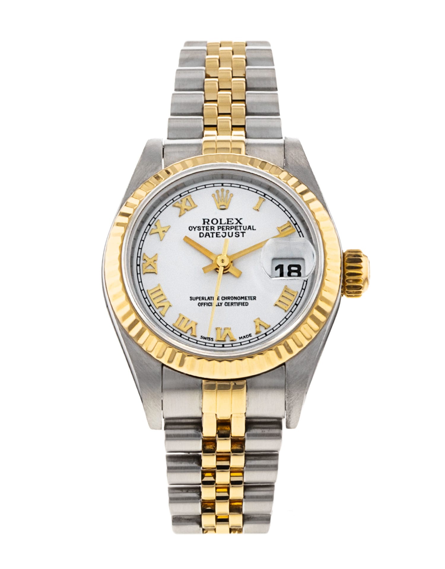 This Rolex Datejust Lady 79173 has a white roman numeral dial and a bracelet strap. This Rolex has undergone a thorough inspection of water resistance, accuracy, functionality and condition to determine the level of reconditioning required to meet our strict standards. It has also been referenced against technical documents and manufacturer records where available to ensure authenticity and a clean history. All our watches have a 24-month warranty for your peace of mind. One of our skilled polishing technicians has removed marks on the case and bracelet of this watch, brought about by daily wear and tear, which is why this watch does not come with the remaining manufacturer’s warranty.