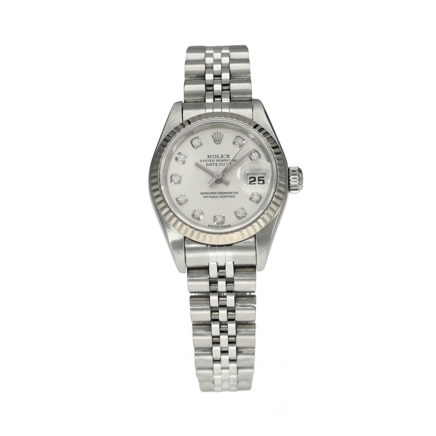 This Rolex Datejust Lady 79174 has a silver diamond dial and a bracelet strap. This Rolex has undergone a thorough inspection of water resistance, accuracy, functionality and condition to determine the level of reconditioning required to meet our strict standards. It has also been referenced against technical documents and manufacturer records where available to ensure authenticity and a clean history. All our watches have a 24-month warranty for your peace of mind. One of our skilled polishing technicians has removed marks on the case and bracelet of this watch, brought about by daily wear and tear, which is why this watch does not come with the remaining manufacturer’s warranty.