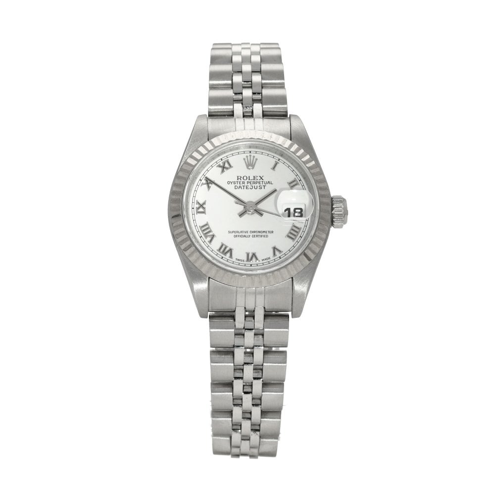 This Rolex Datejust Lady 79174 has a white roman numeral dial and a bracelet strap. This Rolex has undergone a thorough inspection of water resistance, accuracy, functionality and condition to determine the level of reconditioning required to meet our strict standards. It has also been referenced against technical documents and manufacturer records where available to ensure authenticity and a clean history. All our watches have a 24-month warranty for your peace of mind. One of our skilled polishing technicians has removed marks on the case and bracelet of this watch, brought about by daily wear and tear, which is why this watch does not come with the remaining manufacturer’s warranty.