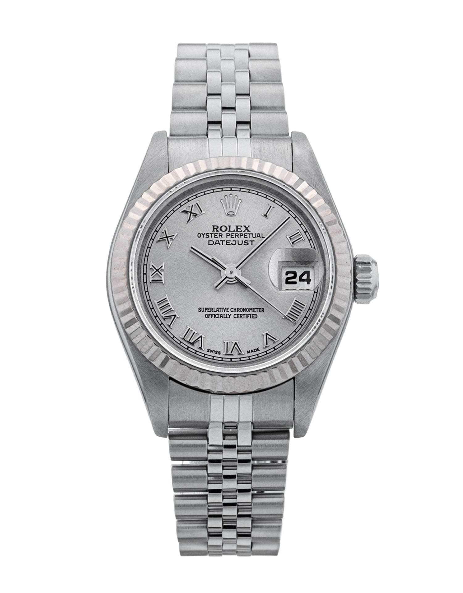 This Rolex Datejust Lady 79174 has a rhodium roman numeral dial and a bracelet strap. This Rolex has undergone a thorough inspection of water resistance, accuracy, functionality and condition to determine the level of reconditioning required to meet our strict standards. It has also been referenced against technical documents and manufacturer records where available to ensure authenticity and a clean history. All our watches have a 24-month warranty for your peace of mind. One of our skilled polishing technicians has removed marks on the case and bracelet of this watch, brought about by daily wear and tear, which is why this watch does not come with the remaining manufacturer’s warranty.