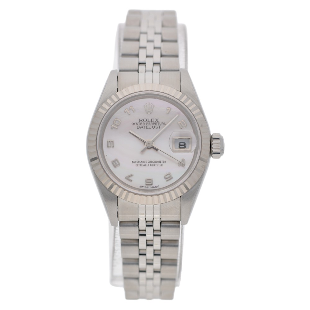 This Rolex Datejust Lady 79174 has a mother of pearl white arabic dial and a bracelet strap. This Rolex has undergone a thorough inspection of water resistance, accuracy, functionality and condition to determine the level of reconditioning required to meet our strict standards. It has also been referenced against technical documents and manufacturer records where available to ensure authenticity and a clean history. All our watches have a 24-month warranty for your peace of mind. One of our skilled polishing technicians has removed marks on the case and bracelet of this watch, brought about by daily wear and tear, which is why this watch does not come with the remaining manufacturer’s warranty.