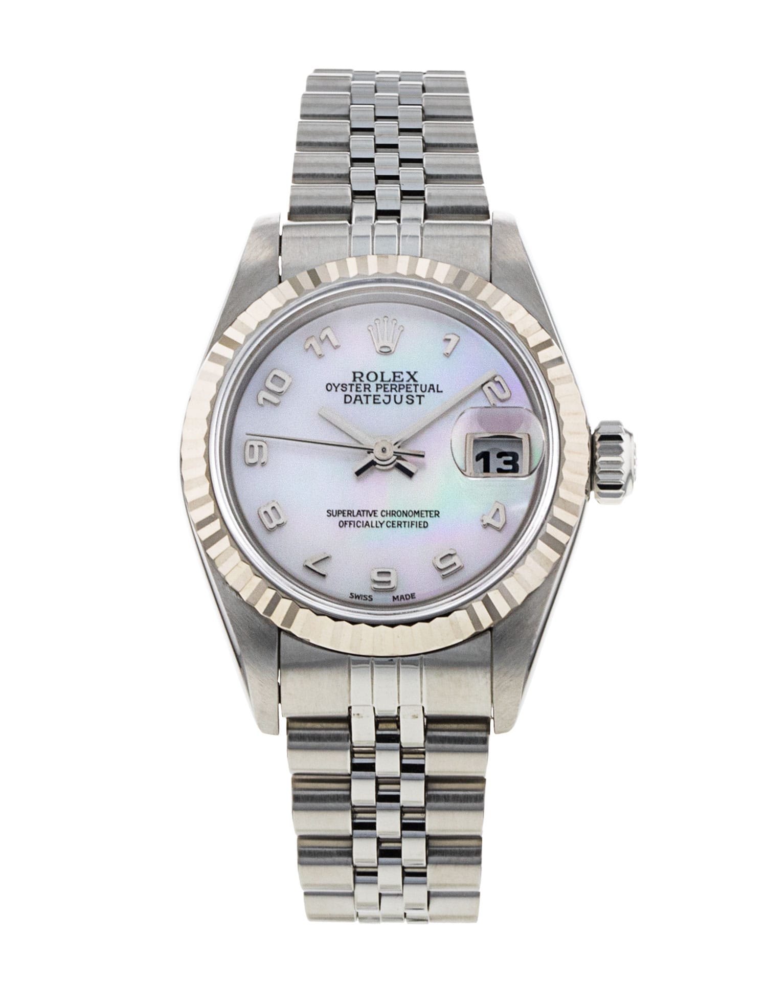 This Rolex Datejust Lady 79174 has a mother of pearl white arabic dial and a bracelet strap. This Rolex has undergone a thorough inspection of water resistance, accuracy, functionality and condition to determine the level of reconditioning required to meet our strict standards. It has also been referenced against technical documents and manufacturer records where available to ensure authenticity and a clean history. All our watches have a 24-month warranty for your peace of mind. One of our skilled polishing technicians has removed marks on the case and bracelet of this watch, brought about by daily wear and tear, which is why this watch does not come with the remaining manufacturer’s warranty.