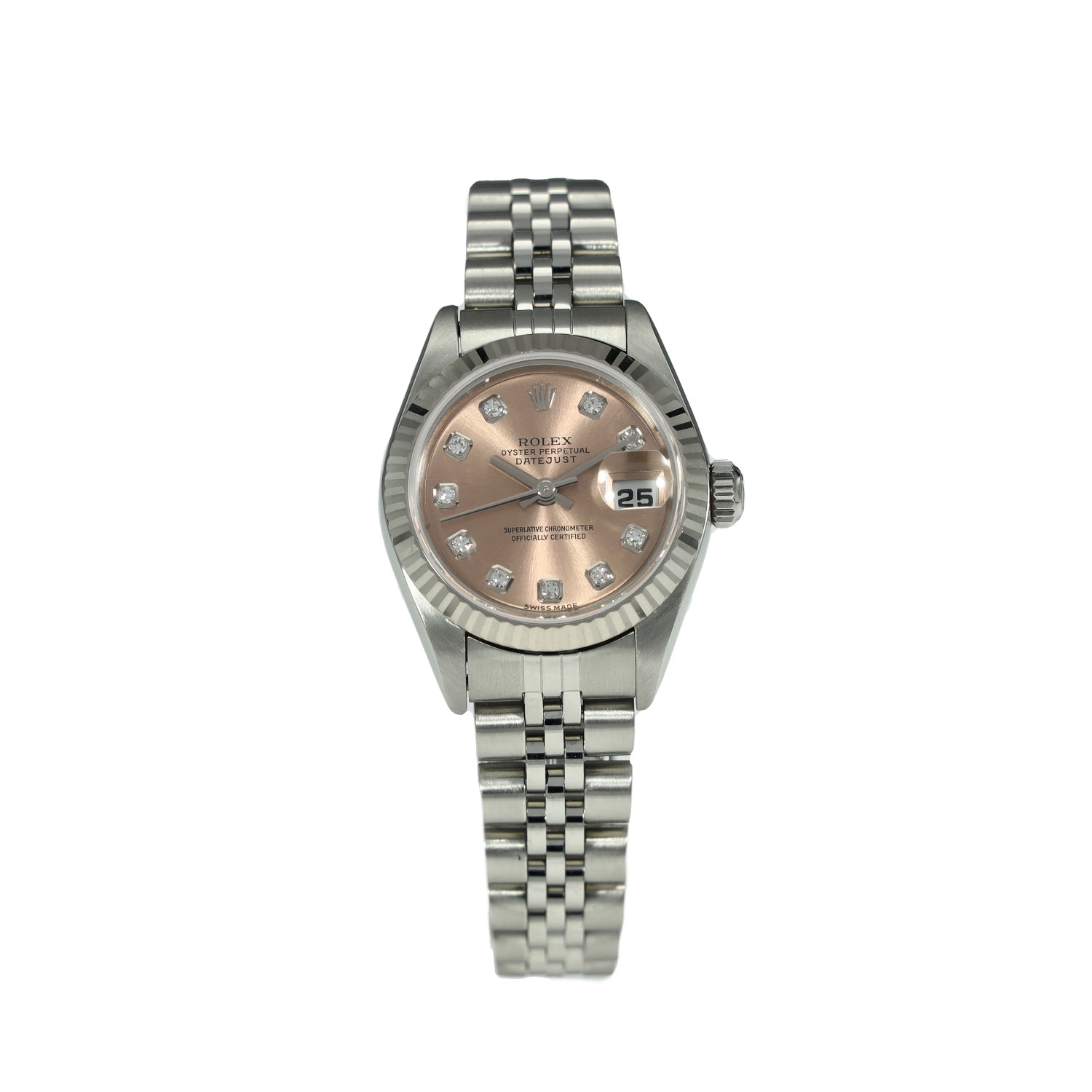 This Rolex Datejust Lady 79174 has a salmon diamond dial and a bracelet strap. This Rolex has undergone a thorough inspection of water resistance, accuracy, functionality and condition to determine the level of reconditioning required to meet our strict standards. It has also been referenced against technical documents and manufacturer records where available to ensure authenticity and a clean history. All our watches have a 24-month warranty for your peace of mind. One of our skilled polishing technicians has removed marks on the case and bracelet of this watch, brought about by daily wear and tear, which is why this watch does not come with the remaining manufacturer’s warranty.