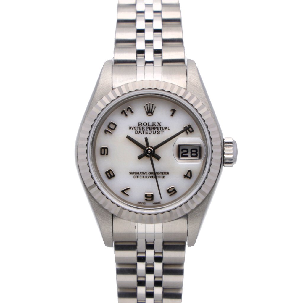 This Rolex Datejust Lady 79174 has a white arabic dial and a bracelet strap. This Rolex has undergone a thorough inspection of water resistance, accuracy, functionality and condition to determine the level of reconditioning required to meet our strict standards. It has also been referenced against technical documents and manufacturer records where available to ensure authenticity and a clean history. All our watches have a 24-month warranty for your peace of mind. One of our skilled polishing technicians has removed marks on the case and bracelet of this watch, brought about by daily wear and tear, which is why this watch does not come with the remaining manufacturer’s warranty.