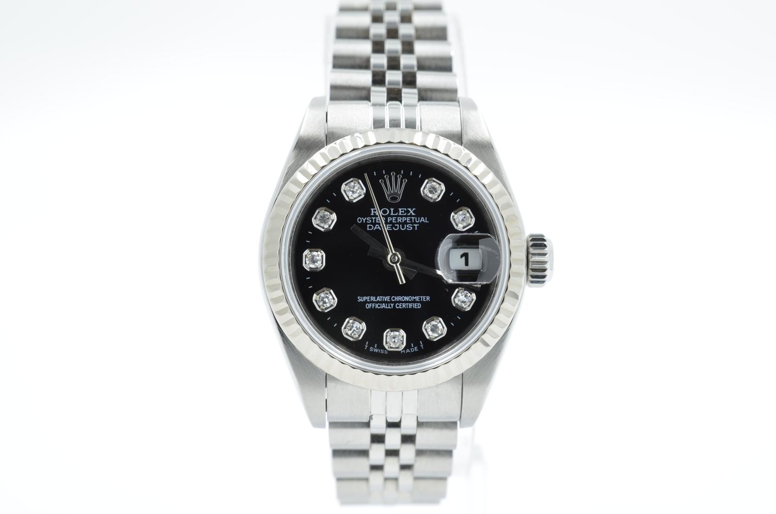 This Rolex Datejust Lady 79174 has a black diamond dial and a bracelet strap. This Rolex has undergone a thorough inspection of water resistance, accuracy, functionality and condition to determine the level of reconditioning required to meet our strict standards. It has also been referenced against technical documents and manufacturer records where available to ensure authenticity and a clean history. All our watches have a 24-month warranty for your peace of mind. One of our skilled polishing technicians has removed marks on the case and bracelet of this watch, brought about by daily wear and tear, which is why this watch does not come with the remaining manufacturer’s warranty.