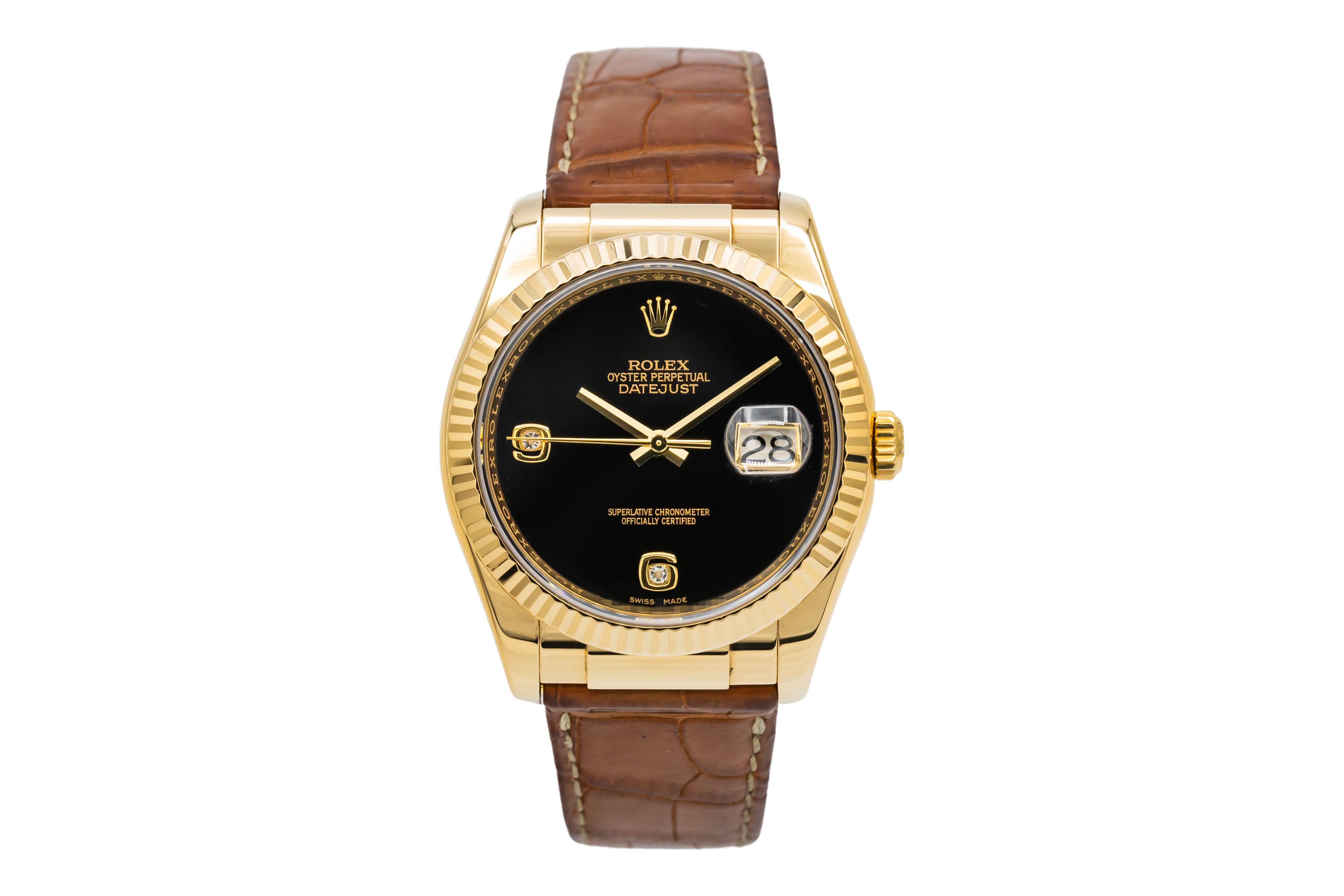 This Rolex Datejust 116138 has a black onyx diamond dial and a leather strap. This Rolex has undergone a thorough inspection of water resistance, accuracy, functionality and condition to determine the level of reconditioning required to meet our strict standards. It has also been referenced against technical documents and manufacturer records where available to ensure authenticity and a clean history. All our watches have a 24-month warranty for your peace of mind. One of our skilled polishing technicians has removed marks on the case and bracelet of this watch, brought about by daily wear and tear, which is why this watch does not come with the remaining manufacturer’s warranty.