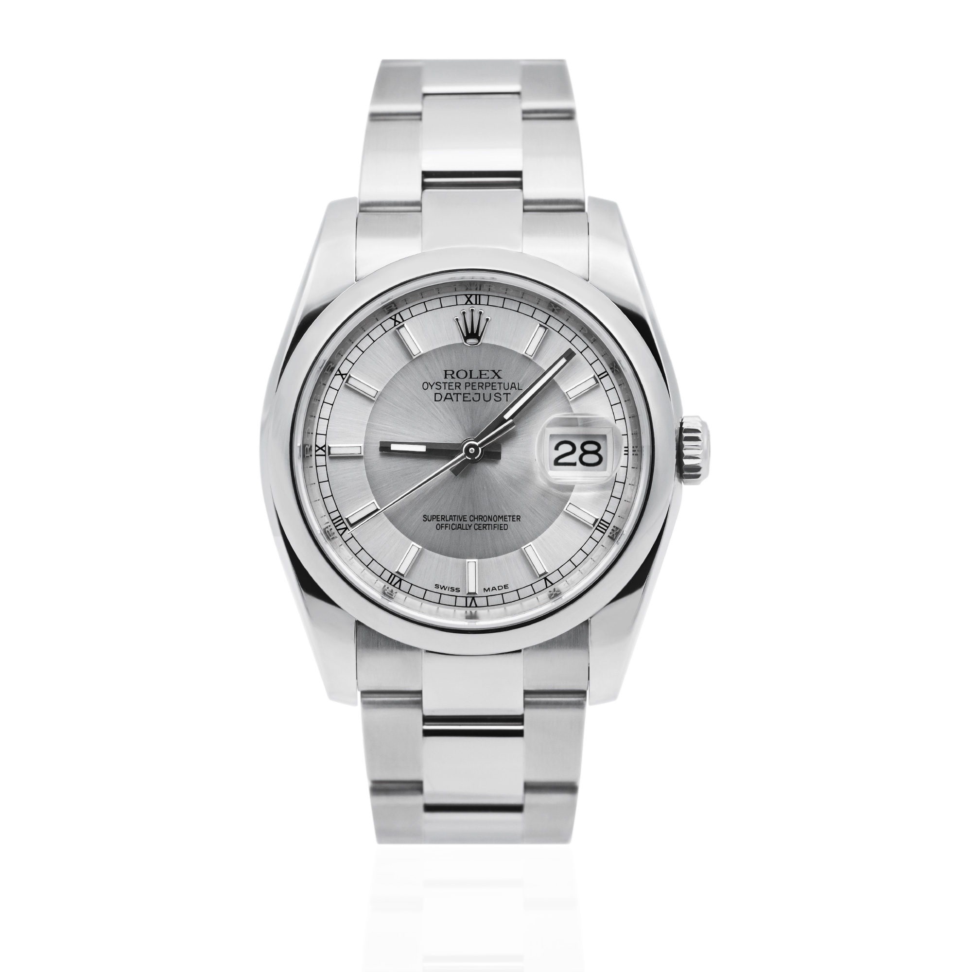 This Rolex Datejust 116200 has a steel & silver baton dial and a bracelet strap. This Rolex has undergone a thorough inspection of water resistance, accuracy, functionality and condition to determine the level of reconditioning required to meet our strict standards. It has also been referenced against technical documents and manufacturer records where available to ensure authenticity and a clean history. All our watches have a 24-month warranty for your peace of mind. One of our skilled polishing technicians has removed marks on the case and bracelet of this watch, brought about by daily wear and tear, which is why this watch does not come with the remaining manufacturer’s warranty.