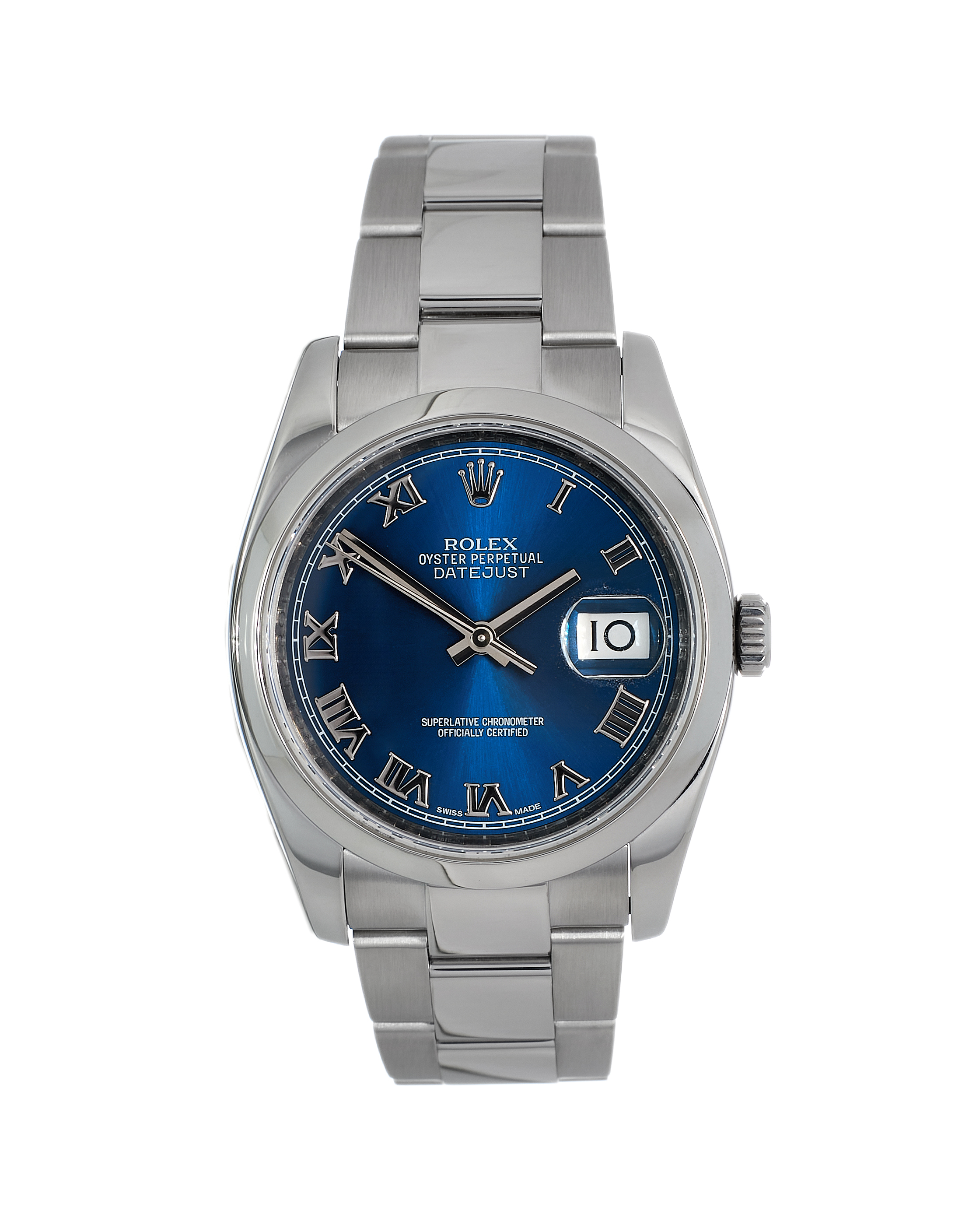 This Rolex Datejust 116200 has a blue roman numeral dial and a bracelet strap. This Rolex has undergone a thorough inspection of water resistance, accuracy, functionality and condition to determine the level of reconditioning required to meet our strict standards. It has also been referenced against technical documents and manufacturer records where available to ensure authenticity and a clean history. All our watches have a 24-month warranty for your peace of mind. One of our skilled polishing technicians has removed marks on the case and bracelet of this watch, brought about by daily wear and tear, which is why this watch does not come with the remaining manufacturer’s warranty.