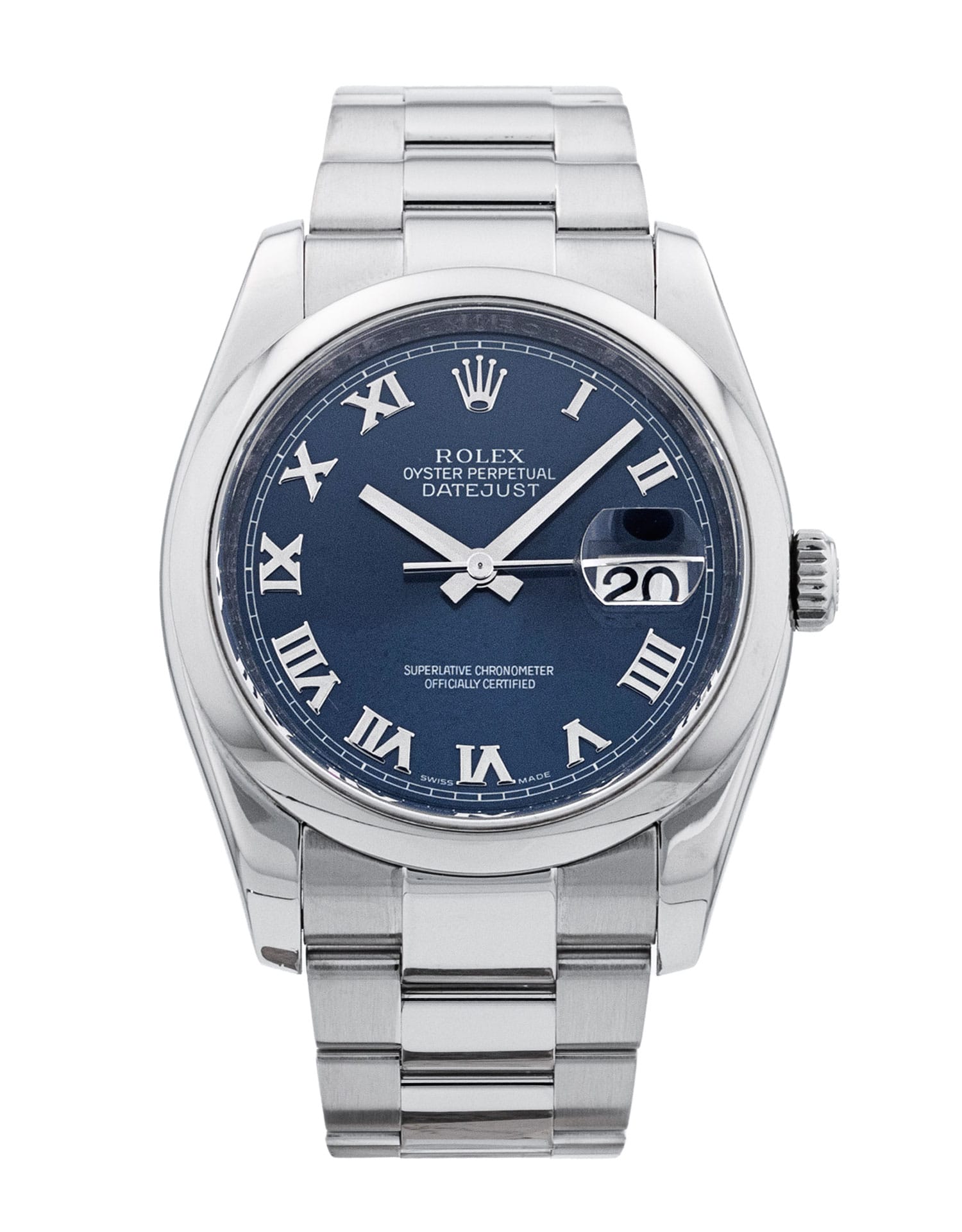 This Rolex Datejust 116200 has a blue roman numeral dial and a bracelet strap. This Rolex has undergone a thorough inspection of water resistance, accuracy, functionality and condition to determine the level of reconditioning required to meet our strict standards. It has also been referenced against technical documents and manufacturer records where available to ensure authenticity and a clean history. All our watches have a 24-month warranty for your peace of mind. One of our skilled polishing technicians has removed marks on the case and bracelet of this watch, brought about by daily wear and tear, which is why this watch does not come with the remaining manufacturer’s warranty.