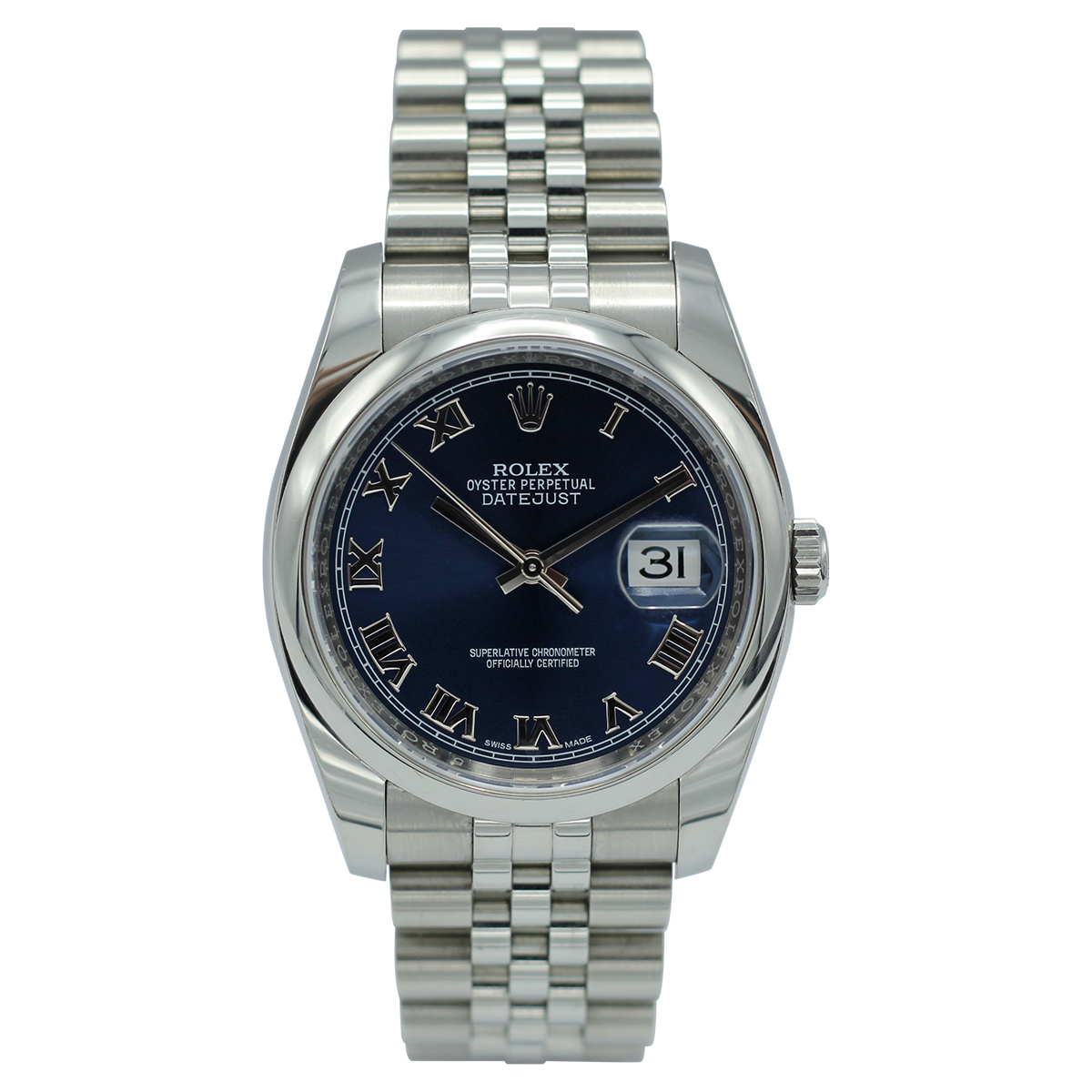 This Rolex Datejust 116200 has a blue roman numeral dial and a bracelet strap. This Rolex has undergone a thorough inspection of water resistance, accuracy, functionality and condition to determine the level of reconditioning required to meet our strict standards. It has also been referenced against technical documents and manufacturer records where available to ensure authenticity and a clean history. All our watches have a 24-month warranty for your peace of mind. One of our skilled polishing technicians has removed marks on the case and bracelet of this watch, brought about by daily wear and tear, which is why this watch does not come with the remaining manufacturer’s warranty.