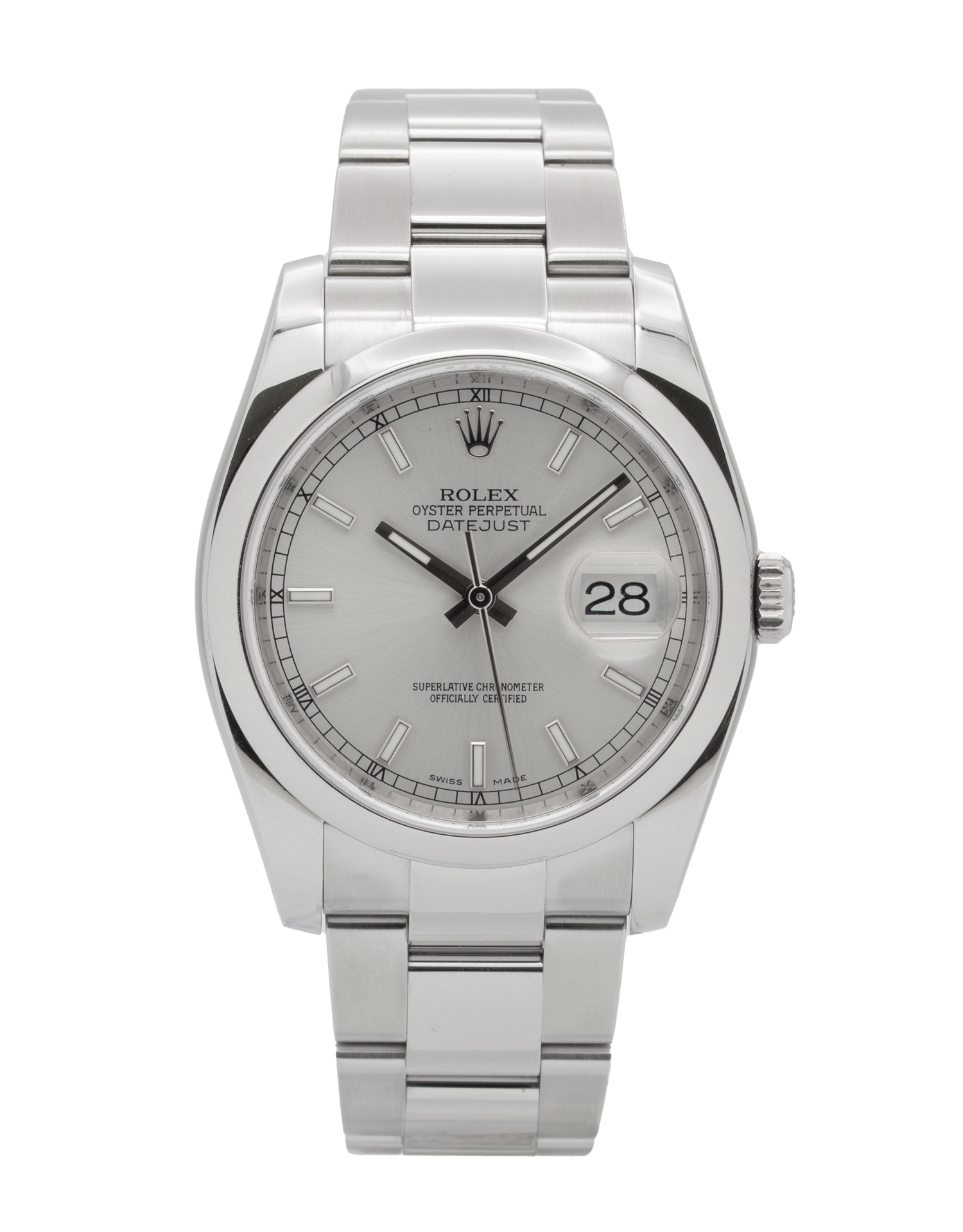 This Rolex Datejust 116200 has a silver baton dial and a bracelet strap. This Rolex has undergone a thorough inspection of water resistance, accuracy, functionality and condition to determine the level of reconditioning required to meet our strict standards. It has also been referenced against technical documents and manufacturer records where available to ensure authenticity and a clean history. All our watches have a 24-month warranty for your peace of mind. One of our skilled polishing technicians has removed marks on the case and bracelet of this watch, brought about by daily wear and tear, which is why this watch does not come with the remaining manufacturer’s warranty.