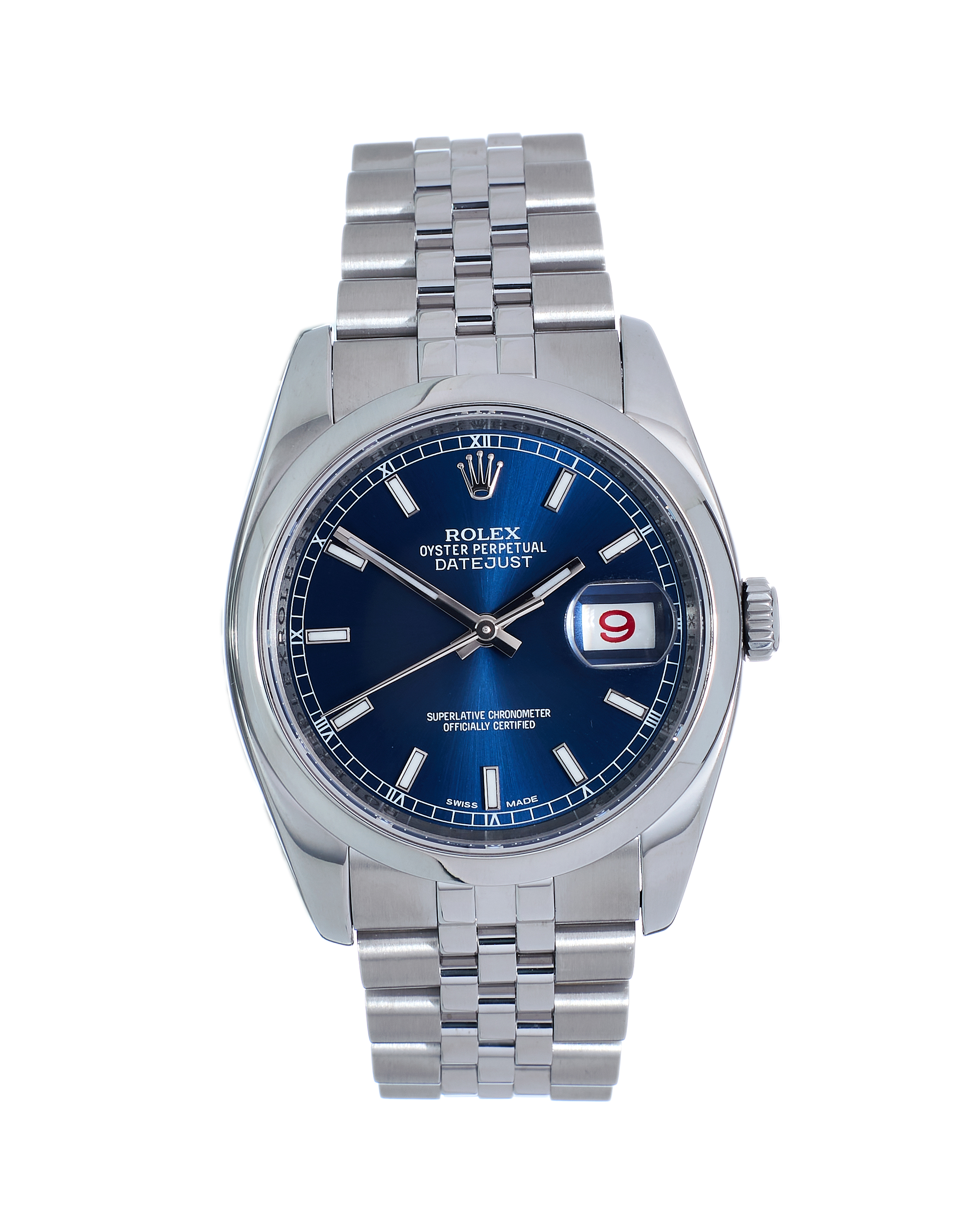 This Rolex Datejust 116200 has a blue baton dial and a bracelet strap. This Rolex has undergone a thorough inspection of water resistance, accuracy, functionality and condition to determine the level of reconditioning required to meet our strict standards. It has also been referenced against technical documents and manufacturer records where available to ensure authenticity and a clean history. All our watches have a 24-month warranty for your peace of mind. One of our skilled polishing technicians has removed marks on the case and bracelet of this watch, brought about by daily wear and tear, which is why this watch does not come with the remaining manufacturer’s warranty.