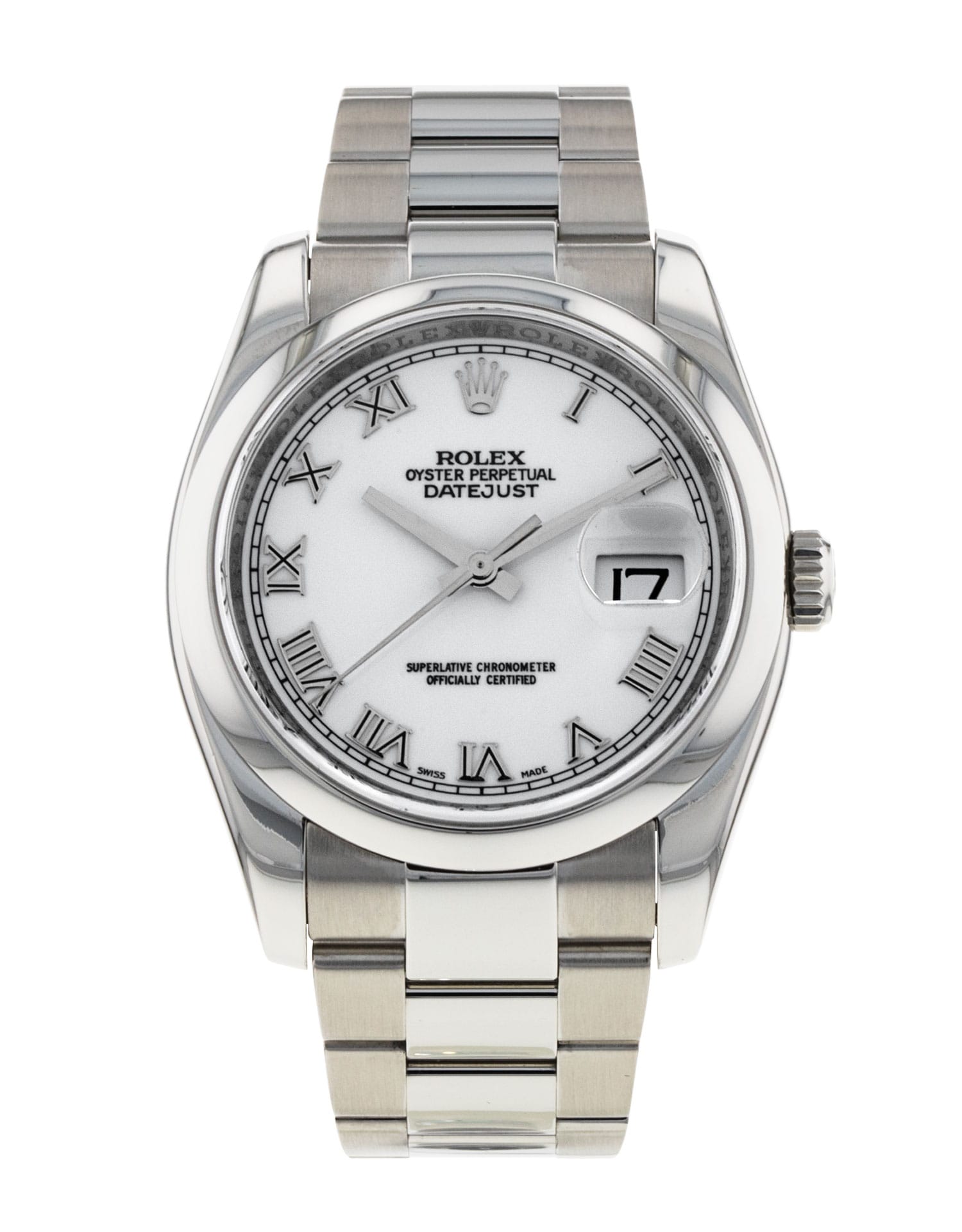 This Rolex Datejust 116200 has a white roman numeral dial and a bracelet strap. This Rolex has undergone a thorough inspection of water resistance, accuracy, functionality and condition to determine the level of reconditioning required to meet our strict standards. It has also been referenced against technical documents and manufacturer records where available to ensure authenticity and a clean history. All our watches have a 24-month warranty for your peace of mind. One of our skilled polishing technicians has removed marks on the case and bracelet of this watch, brought about by daily wear and tear, which is why this watch does not come with the remaining manufacturer’s warranty.