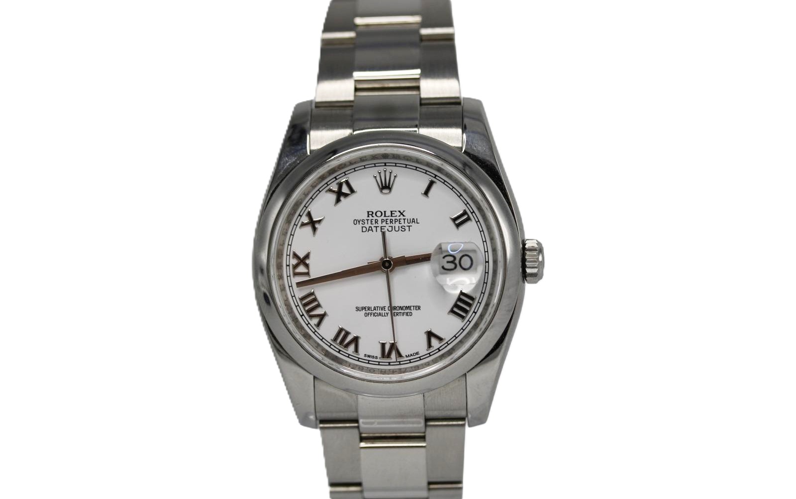 This Rolex Datejust 116200 has a white roman numeral dial and a bracelet strap. This Rolex has undergone a thorough inspection of water resistance, accuracy, functionality and condition to determine the level of reconditioning required to meet our strict standards. It has also been referenced against technical documents and manufacturer records where available to ensure authenticity and a clean history. All our watches have a 24-month warranty for your peace of mind. One of our skilled polishing technicians has removed marks on the case and bracelet of this watch, brought about by daily wear and tear, which is why this watch does not come with the remaining manufacturer’s warranty.