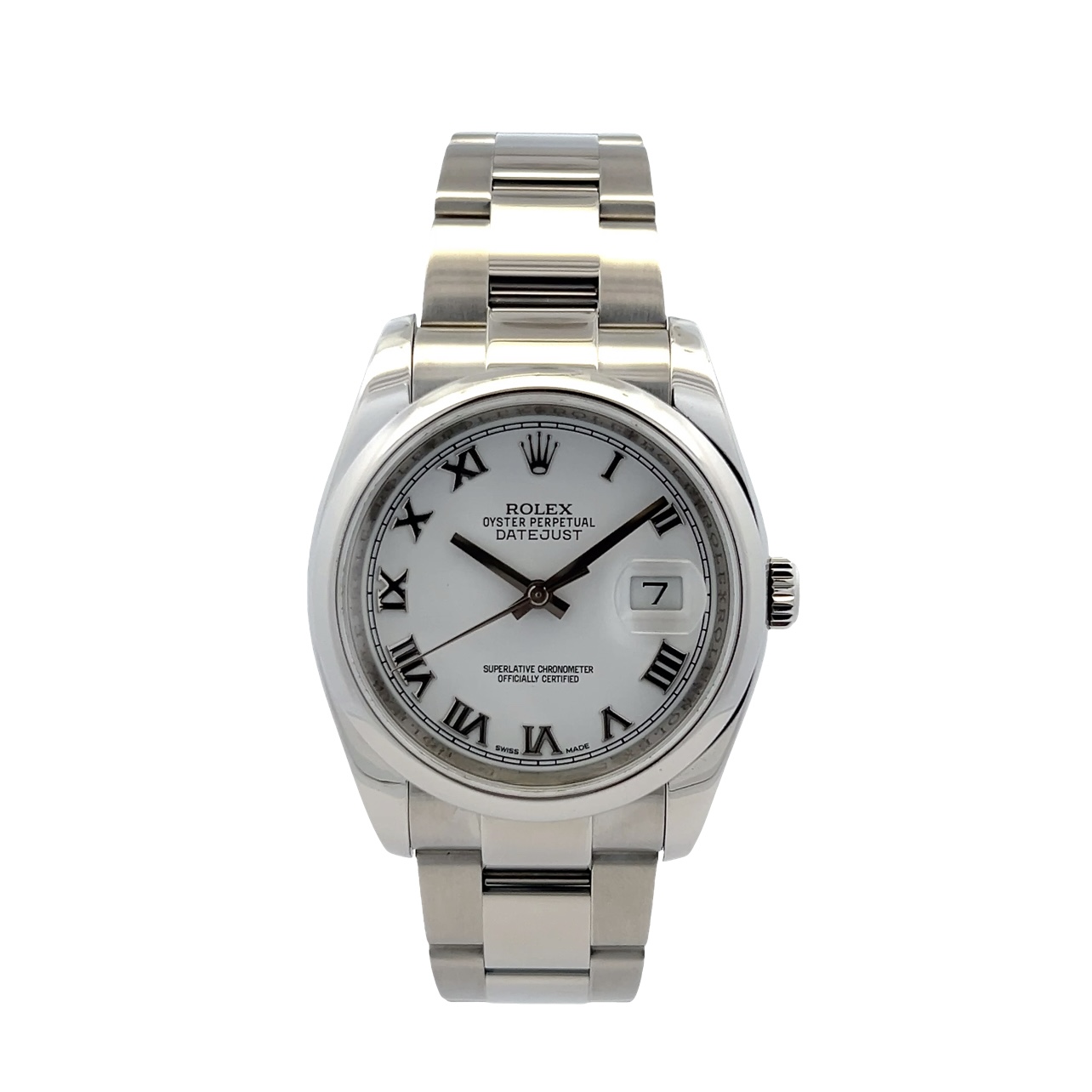 This Rolex Datejust 116200 has a white roman numeral dial and a bracelet strap. This Rolex has undergone a thorough inspection of water resistance, accuracy, functionality and condition to determine the level of reconditioning required to meet our strict standards. It has also been referenced against technical documents and manufacturer records where available to ensure authenticity and a clean history. All our watches have a 24-month warranty for your peace of mind. One of our skilled polishing technicians has removed marks on the case and bracelet of this watch, brought about by daily wear and tear, which is why this watch does not come with the remaining manufacturer’s warranty.