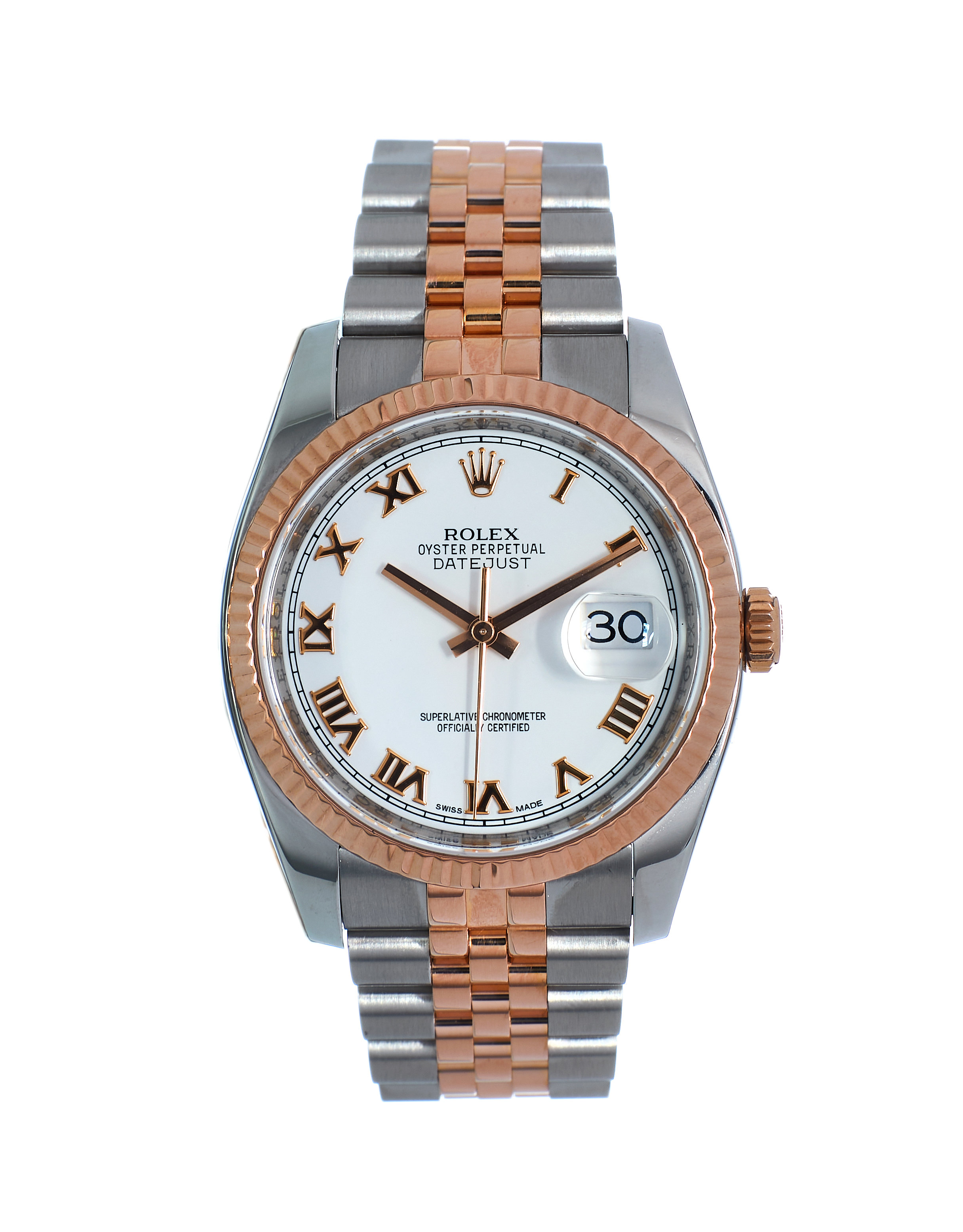 This Rolex Datejust 116231 has a white roman numeral dial and a bracelet strap. This Rolex has undergone a thorough inspection of water resistance, accuracy, functionality and condition to determine the level of reconditioning required to meet our strict standards. It has also been referenced against technical documents and manufacturer records where available to ensure authenticity and a clean history. All our watches have a 24-month warranty for your peace of mind. One of our skilled polishing technicians has removed marks on the case and bracelet of this watch, brought about by daily wear and tear, which is why this watch does not come with the remaining manufacturer’s warranty.