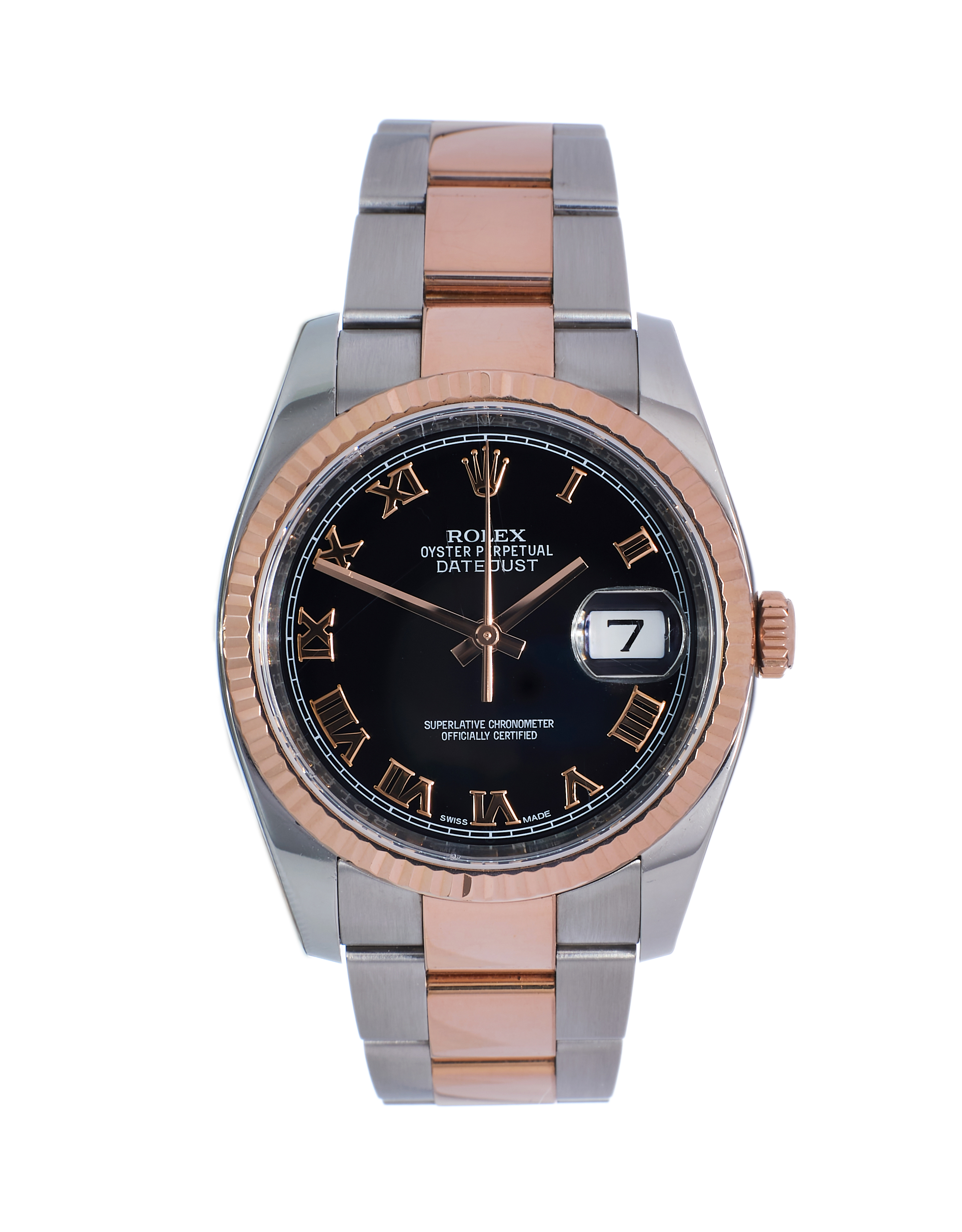 This Rolex Datejust 116231 has a black roman numeral dial and a bracelet strap. This Rolex has undergone a thorough inspection of water resistance, accuracy, functionality and condition to determine the level of reconditioning required to meet our strict standards. It has also been referenced against technical documents and manufacturer records where available to ensure authenticity and a clean history. All our watches have a 24-month warranty for your peace of mind. One of our skilled polishing technicians has removed marks on the case and bracelet of this watch, brought about by daily wear and tear, which is why this watch does not come with the remaining manufacturer’s warranty.