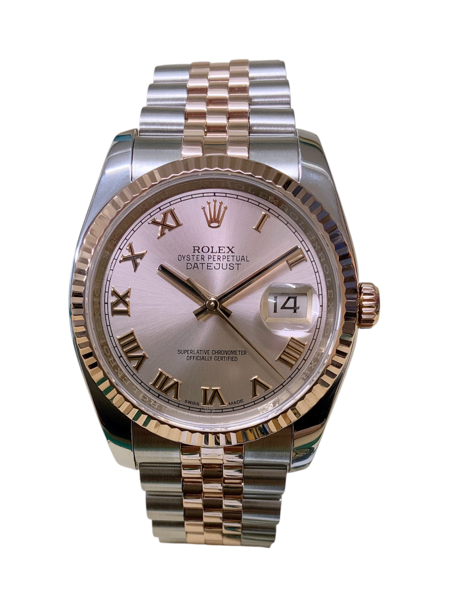 This Rolex Datejust 116231 has a pink roman numeral dial and a bracelet strap. This Rolex has undergone a thorough inspection of water resistance, accuracy, functionality and condition to determine the level of reconditioning required to meet our strict standards. It has also been referenced against technical documents and manufacturer records where available to ensure authenticity and a clean history. All our watches have a 24-month warranty for your peace of mind. One of our skilled polishing technicians has removed marks on the case and bracelet of this watch, brought about by daily wear and tear, which is why this watch does not come with the remaining manufacturer’s warranty.