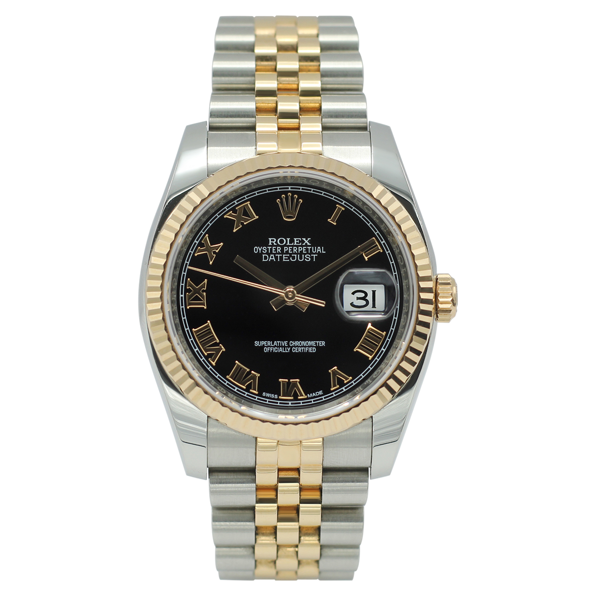 This Rolex Datejust 116231 has a black roman numeral dial and a bracelet strap. This Rolex has undergone a thorough inspection of water resistance, accuracy, functionality and condition to determine the level of reconditioning required to meet our strict standards. It has also been referenced against technical documents and manufacturer records where available to ensure authenticity and a clean history. All our watches have a 24-month warranty for your peace of mind. One of our skilled polishing technicians has removed marks on the case and bracelet of this watch, brought about by daily wear and tear, which is why this watch does not come with the remaining manufacturer’s warranty.