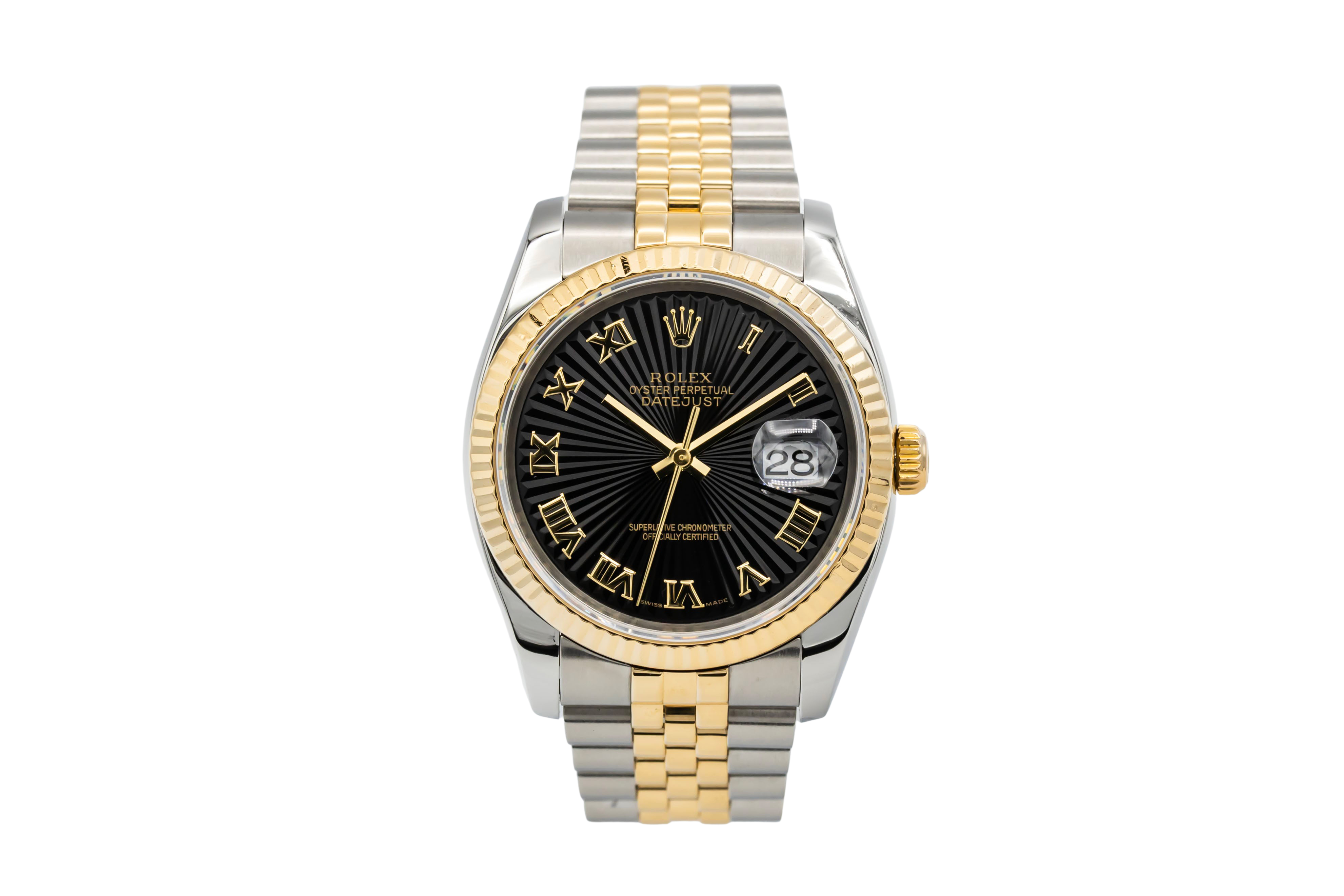 This Rolex Datejust 116233 has a black roman numeral sunbeam dial and a bracelet strap. This Rolex has undergone a thorough inspection of water resistance, accuracy, functionality and condition to determine the level of reconditioning required to meet our strict standards. It has also been referenced against technical documents and manufacturer records where available to ensure authenticity and a clean history. All our watches have a 24-month warranty for your peace of mind. One of our skilled polishing technicians has removed marks on the case and bracelet of this watch, brought about by daily wear and tear, which is why this watch does not come with the remaining manufacturer’s warranty.