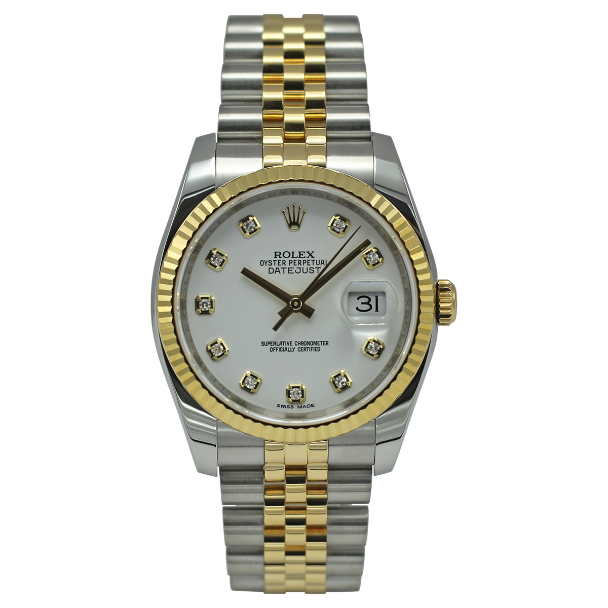 This Rolex Datejust 116233 has a white diamond dial and a bracelet strap. This Rolex has undergone a thorough inspection of water resistance, accuracy, functionality and condition to determine the level of reconditioning required to meet our strict standards. It has also been referenced against technical documents and manufacturer records where available to ensure authenticity and a clean history. All our watches have a 24-month warranty for your peace of mind. One of our skilled polishing technicians has removed marks on the case and bracelet of this watch, brought about by daily wear and tear, which is why this watch does not come with the remaining manufacturer’s warranty.