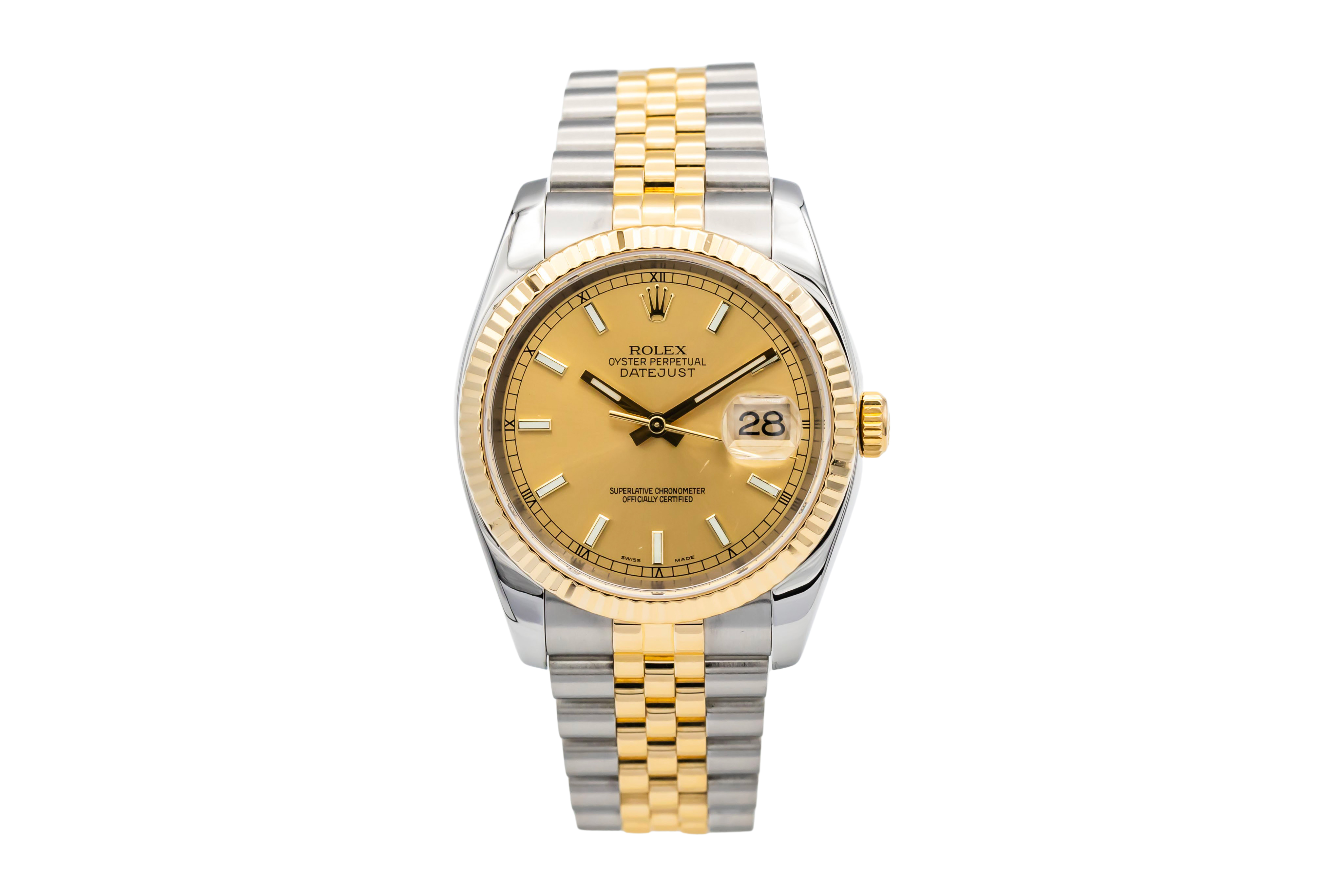 This Rolex Datejust 116233 has a champagne baton dial and a bracelet strap. This Rolex has undergone a thorough inspection of water resistance, accuracy, functionality and condition to determine the level of reconditioning required to meet our strict standards. It has also been referenced against technical documents and manufacturer records where available to ensure authenticity and a clean history. All our watches have a 24-month warranty for your peace of mind. One of our skilled polishing technicians has removed marks on the case and bracelet of this watch, brought about by daily wear and tear, which is why this watch does not come with the remaining manufacturer’s warranty.