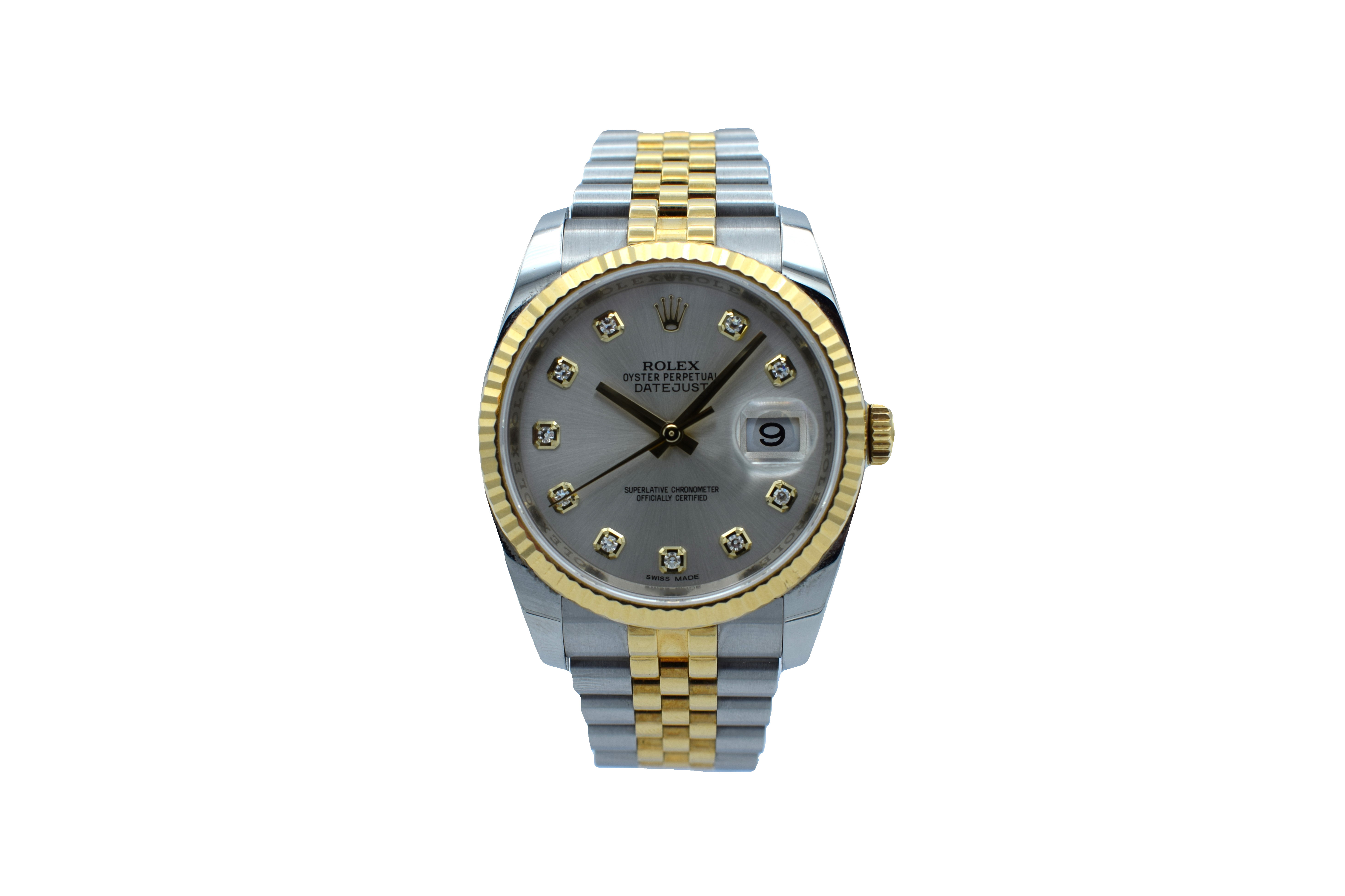This Rolex Datejust 116233 has a silver diamond dial and a bracelet strap. This Rolex has undergone a thorough inspection of water resistance, accuracy, functionality and condition to determine the level of reconditioning required to meet our strict standards. It has also been referenced against technical documents and manufacturer records where available to ensure authenticity and a clean history. All our watches have a 24-month warranty for your peace of mind. One of our skilled polishing technicians has removed marks on the case and bracelet of this watch, brought about by daily wear and tear, which is why this watch does not come with the remaining manufacturer’s warranty.