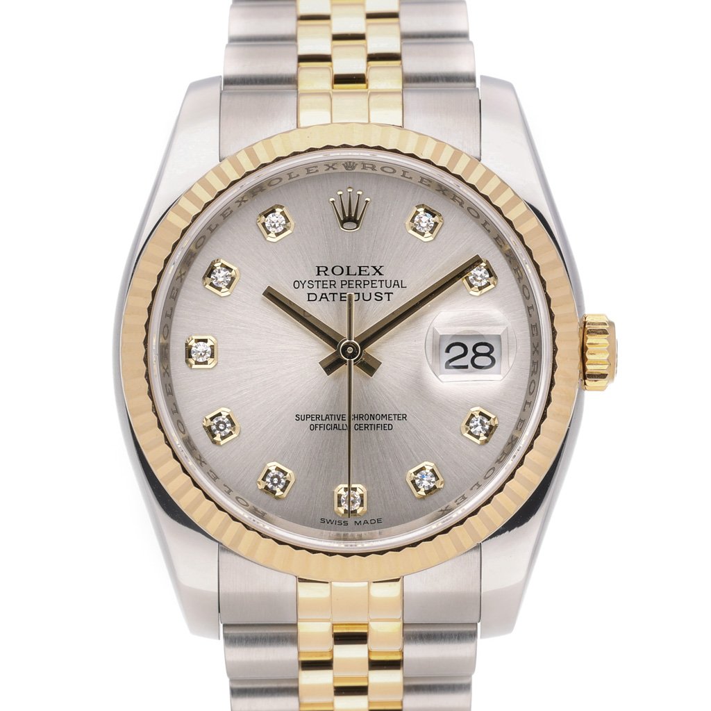 This Rolex Datejust 116233 has a silver diamond dial and a bracelet strap. This Rolex has undergone a thorough inspection of water resistance, accuracy, functionality and condition to determine the level of reconditioning required to meet our strict standards. It has also been referenced against technical documents and manufacturer records where available to ensure authenticity and a clean history. All our watches have a 24-month warranty for your peace of mind. One of our skilled polishing technicians has removed marks on the case and bracelet of this watch, brought about by daily wear and tear, which is why this watch does not come with the remaining manufacturer’s warranty.