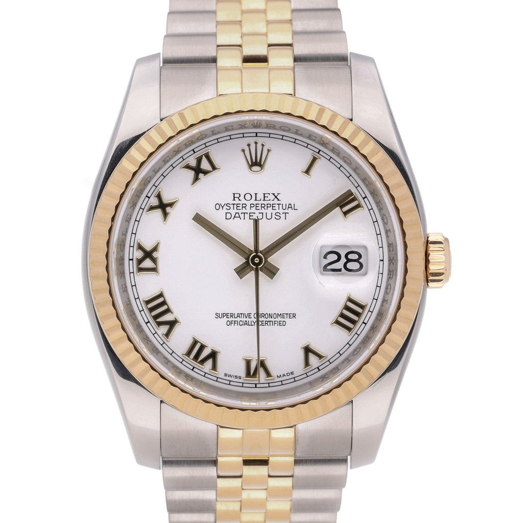This Rolex Datejust 116233 has a white roman numeral dial and a bracelet strap. This Rolex has undergone a thorough inspection of water resistance, accuracy, functionality and condition to determine the level of reconditioning required to meet our strict standards. It has also been referenced against technical documents and manufacturer records where available to ensure authenticity and a clean history. All our watches have a 24-month warranty for your peace of mind. One of our skilled polishing technicians has removed marks on the case and bracelet of this watch, brought about by daily wear and tear, which is why this watch does not come with the remaining manufacturer’s warranty.