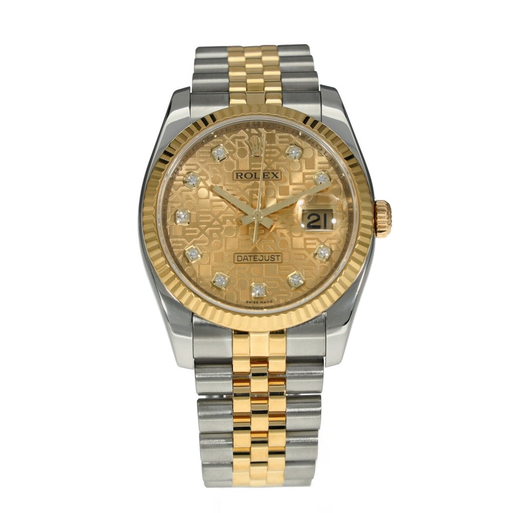 This Rolex Datejust 116233 has a champagne jubilee diamond dial and a bracelet strap. This Rolex has undergone a thorough inspection of water resistance, accuracy, functionality and condition to determine the level of reconditioning required to meet our strict standards. It has also been referenced against technical documents and manufacturer records where available to ensure authenticity and a clean history. All our watches have a 24-month warranty for your peace of mind. One of our skilled polishing technicians has removed marks on the case and bracelet of this watch, brought about by daily wear and tear, which is why this watch does not come with the remaining manufacturer’s warranty.