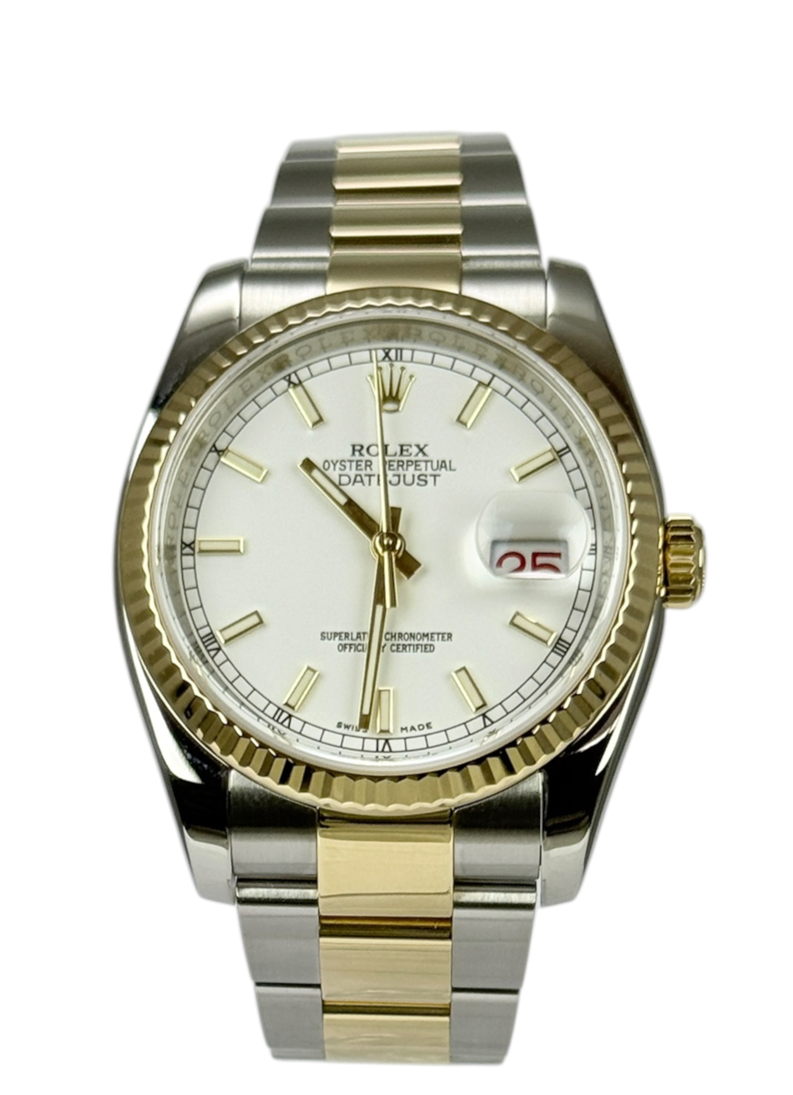 This Rolex Datejust 116233 has a white baton dial and a bracelet strap. This Rolex has undergone a thorough inspection of water resistance, accuracy, functionality and condition to determine the level of reconditioning required to meet our strict standards. It has also been referenced against technical documents and manufacturer records where available to ensure authenticity and a clean history. All our watches have a 24-month warranty for your peace of mind. One of our skilled polishing technicians has removed marks on the case and bracelet of this watch, brought about by daily wear and tear, which is why this watch does not come with the remaining manufacturer’s warranty.