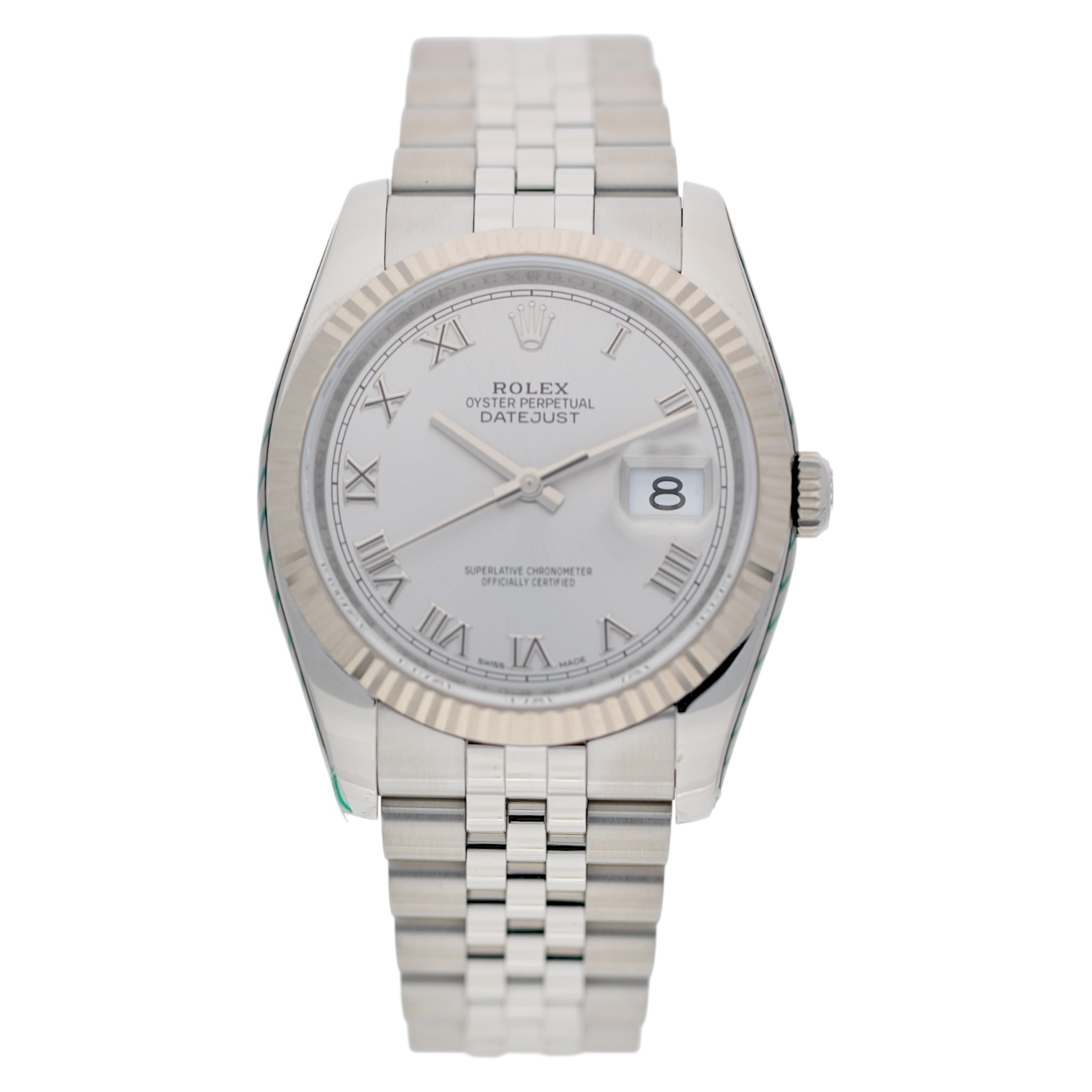 This Rolex Datejust 116234 has a silver roman numeral dial and a bracelet strap. This Rolex has undergone a thorough inspection of water resistance, accuracy, functionality and condition to determine the level of reconditioning required to meet our strict standards. It has also been referenced against technical documents and manufacturer records where available to ensure authenticity and a clean history. All our watches have a 24-month warranty for your peace of mind. One of our skilled polishing technicians has removed marks on the case and bracelet of this watch, brought about by daily wear and tear, which is why this watch does not come with the remaining manufacturer’s warranty.