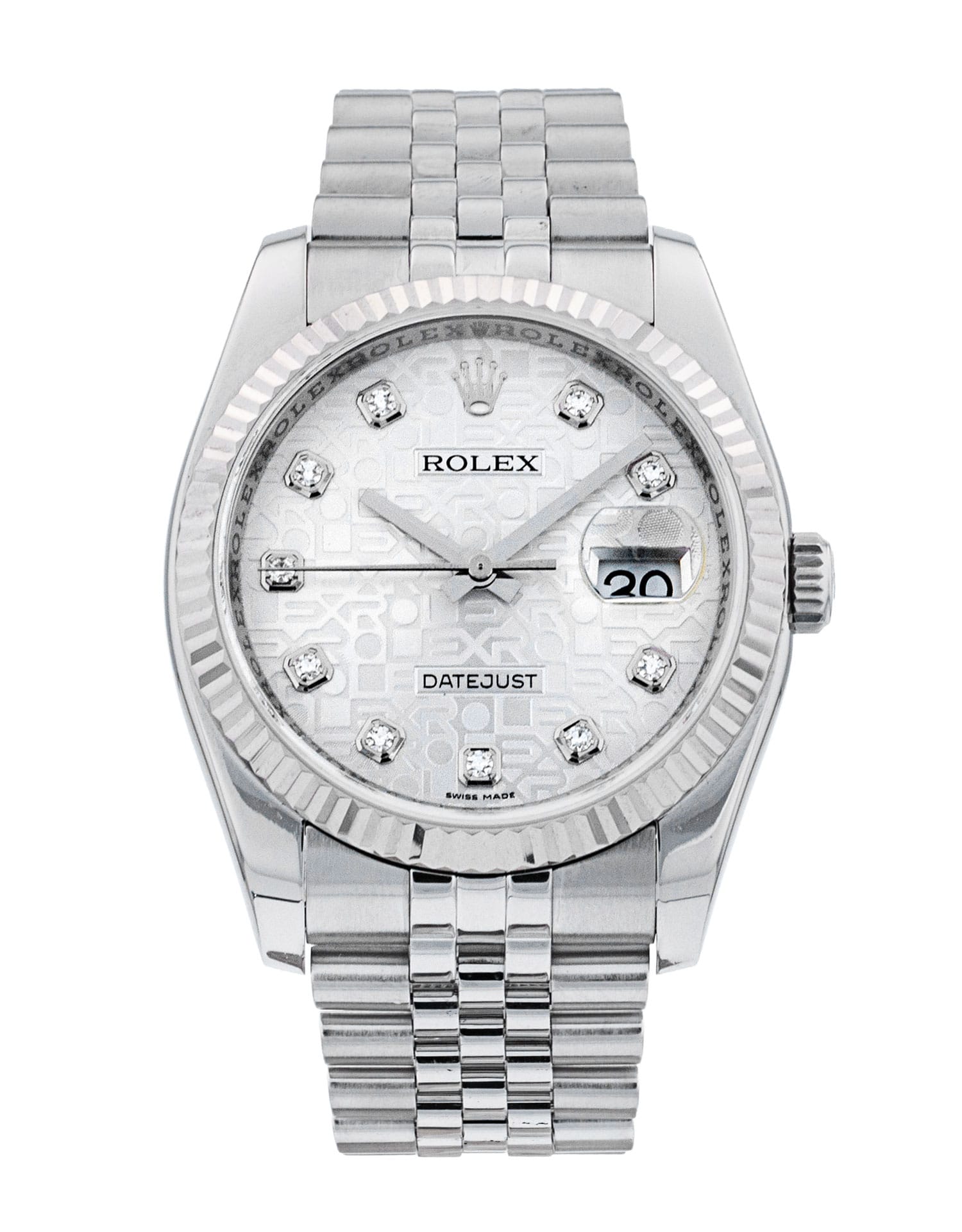 This Rolex Datejust 116234 has a silver jubilee diamond dial and a bracelet strap. This Rolex has undergone a thorough inspection of water resistance, accuracy, functionality and condition to determine the level of reconditioning required to meet our strict standards. It has also been referenced against technical documents and manufacturer records where available to ensure authenticity and a clean history. All our watches have a 24-month warranty for your peace of mind. One of our skilled polishing technicians has removed marks on the case and bracelet of this watch, brought about by daily wear and tear, which is why this watch does not come with the remaining manufacturer’s warranty.