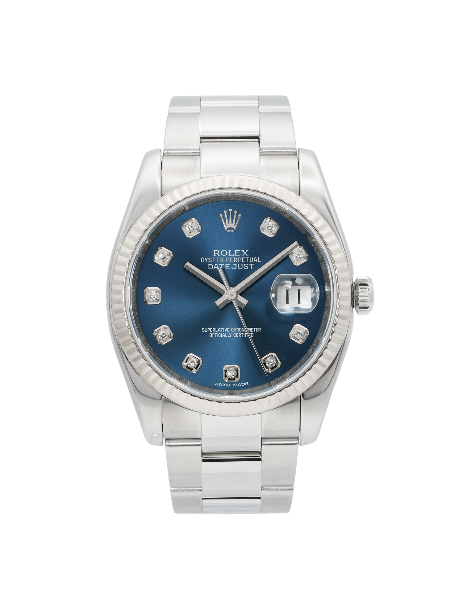 This Rolex Datejust 116234 has a blue diamond dial and a bracelet strap. This Rolex has undergone a thorough inspection of water resistance, accuracy, functionality and condition to determine the level of reconditioning required to meet our strict standards. It has also been referenced against technical documents and manufacturer records where available to ensure authenticity and a clean history. All our watches have a 24-month warranty for your peace of mind. One of our skilled polishing technicians has removed marks on the case and bracelet of this watch, brought about by daily wear and tear, which is why this watch does not come with the remaining manufacturer’s warranty.
