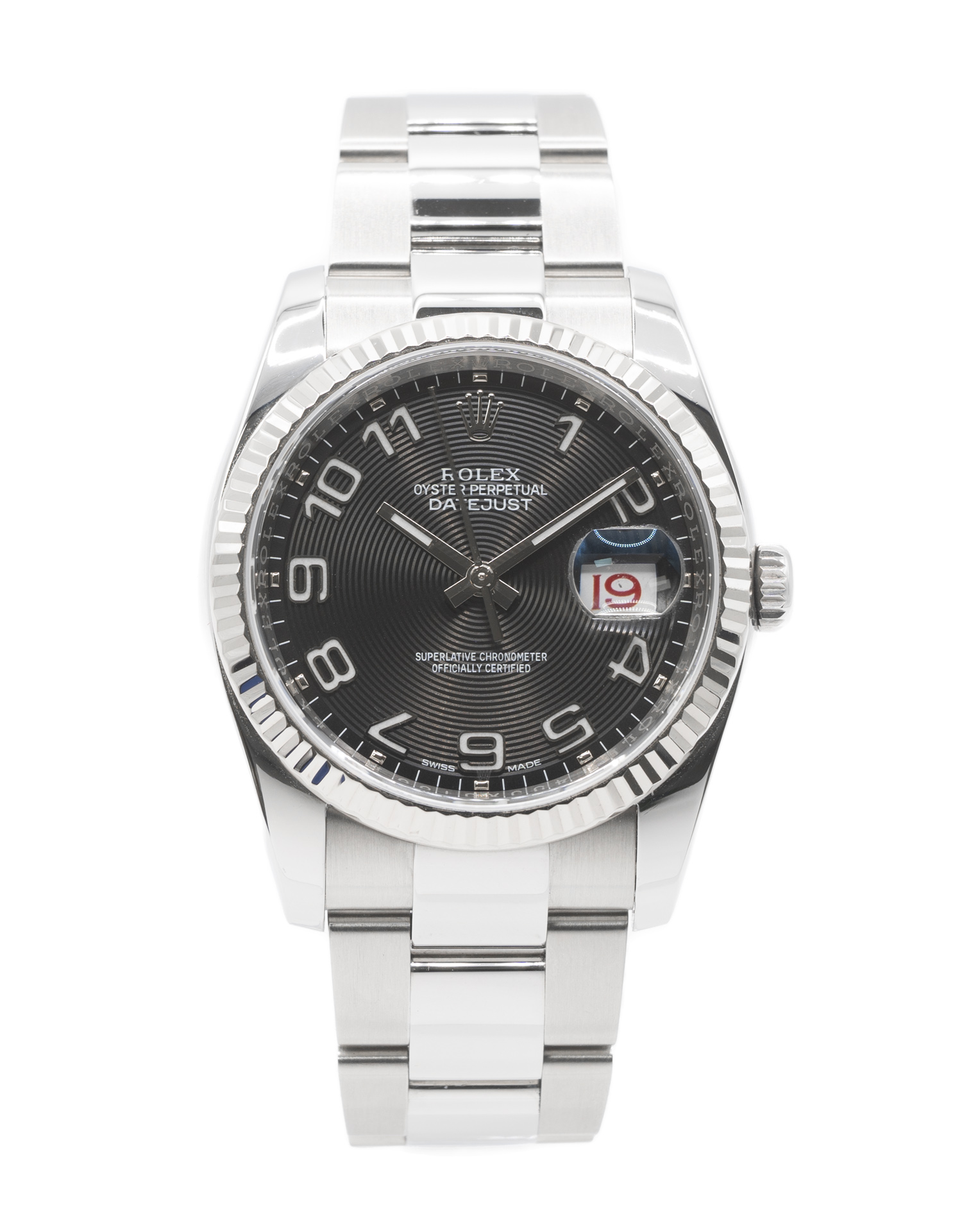 This Rolex Datejust 116234 has a steel concentric arabic dial and a bracelet strap. This Rolex has undergone a thorough inspection of water resistance, accuracy, functionality and condition to determine the level of reconditioning required to meet our strict standards. It has also been referenced against technical documents and manufacturer records where available to ensure authenticity and a clean history. All our watches have a 24-month warranty for your peace of mind. One of our skilled polishing technicians has removed marks on the case and bracelet of this watch, brought about by daily wear and tear, which is why this watch does not come with the remaining manufacturer’s warranty.