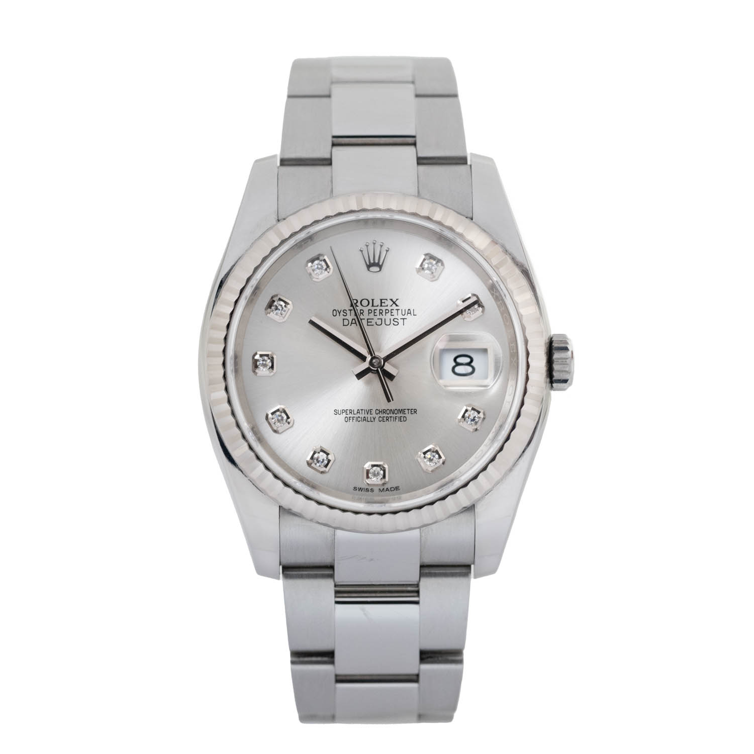 This Rolex Datejust 116234 has a silver diamond dial and a bracelet strap. This Rolex has undergone a thorough inspection of water resistance, accuracy, functionality and condition to determine the level of reconditioning required to meet our strict standards. It has also been referenced against technical documents and manufacturer records where available to ensure authenticity and a clean history. Our watches have a 24-month warranty for your peace of mind, in conjunction with any remaining manufacturer’s warranty from new or from service. To maintain the manufacturer’s warranty on this watch, it has not been polished in our service centre.