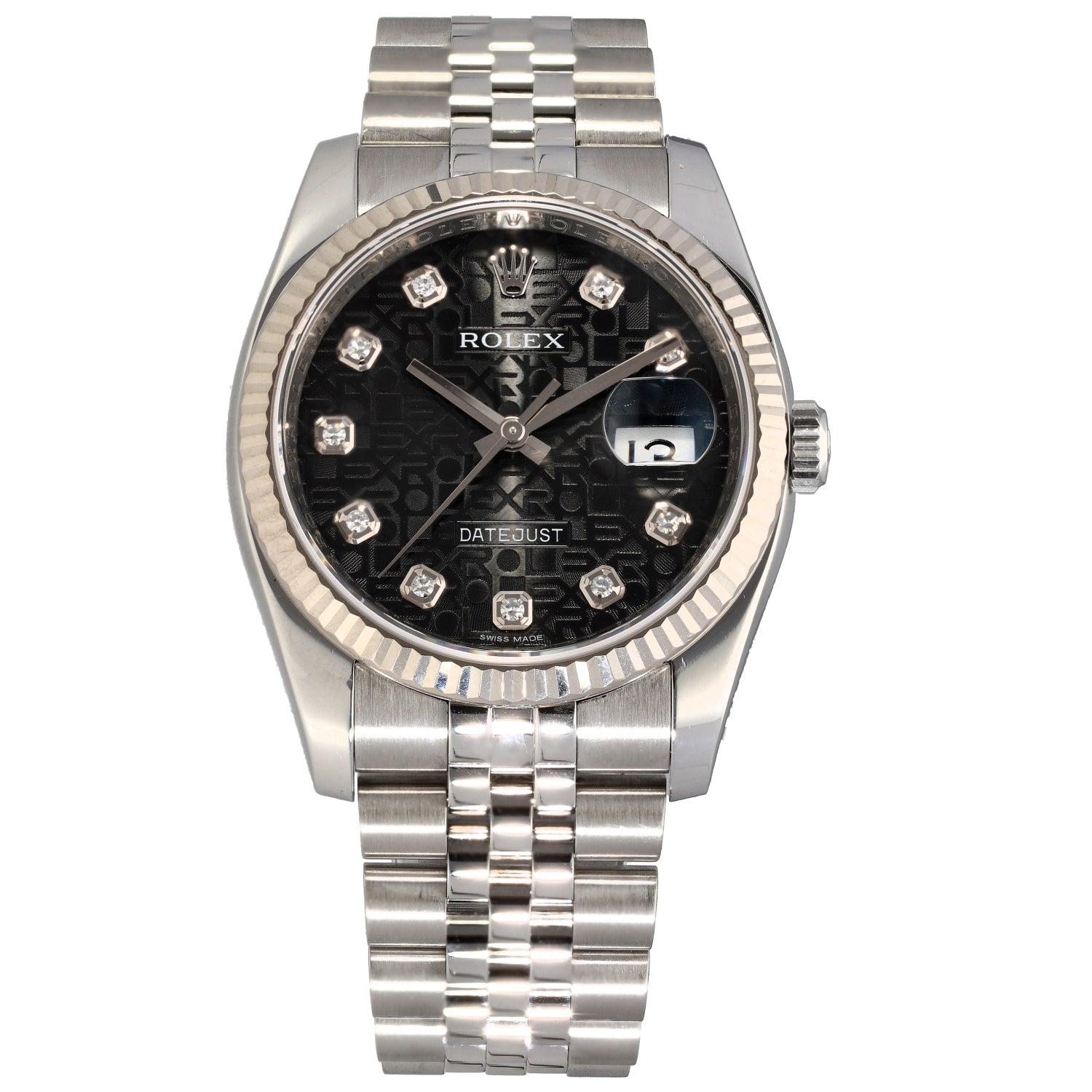 This Rolex Datejust 116234 has a black diamond dial and a bracelet strap. This Rolex has undergone a thorough inspection of water resistance, accuracy, functionality and condition to determine the level of reconditioning required to meet our strict standards. It has also been referenced against technical documents and manufacturer records where available to ensure authenticity and a clean history. All our watches have a 24-month warranty for your peace of mind. One of our skilled polishing technicians has removed marks on the case and bracelet of this watch, brought about by daily wear and tear, which is why this watch does not come with the remaining manufacturer’s warranty.