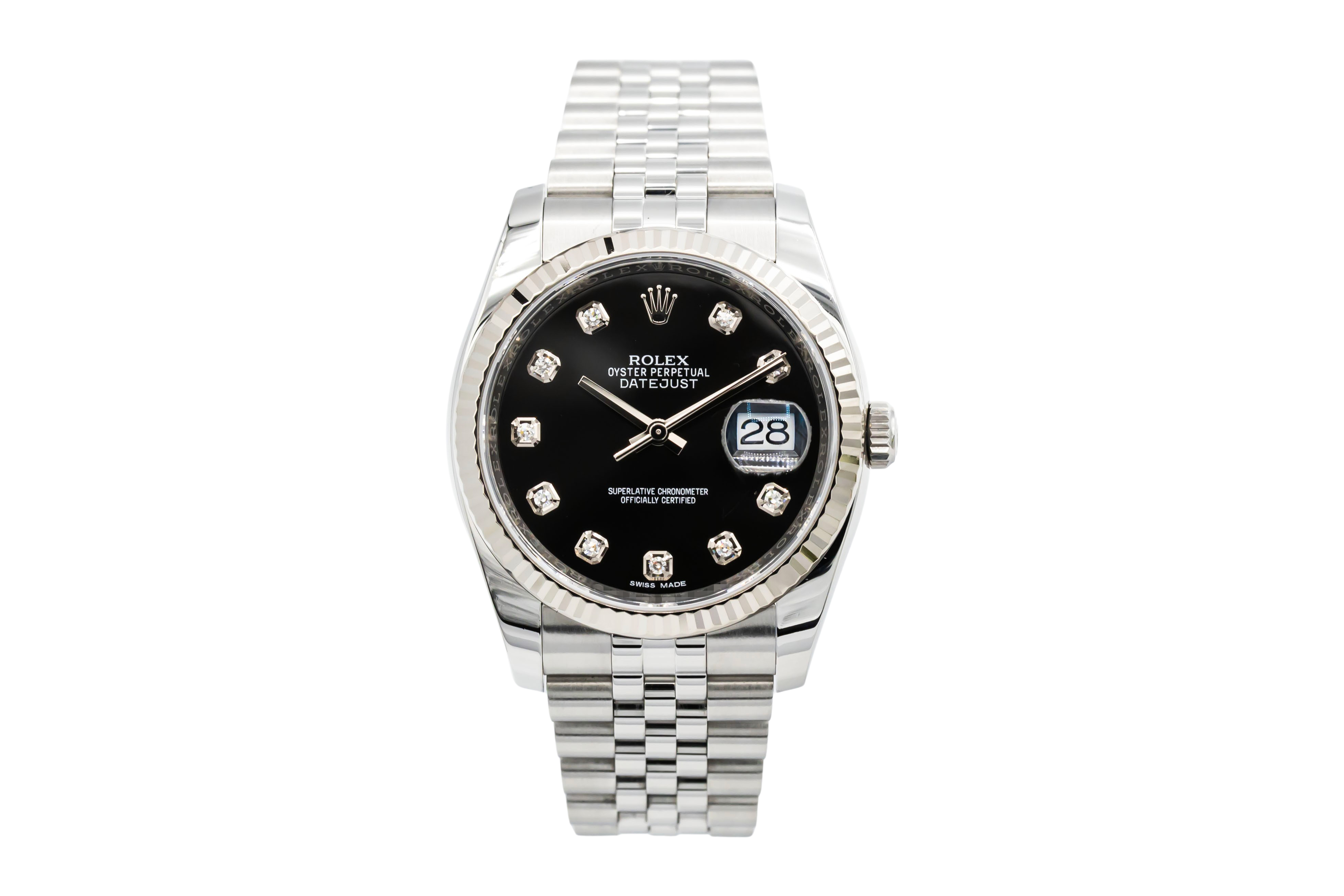 This Rolex Datejust 116234 has a black diamond dial and a bracelet strap. This Rolex has undergone a thorough inspection of water resistance, accuracy, functionality and condition to determine the level of reconditioning required to meet our strict standards. It has also been referenced against technical documents and manufacturer records where available to ensure authenticity and a clean history. All our watches have a 24-month warranty for your peace of mind. One of our skilled polishing technicians has removed marks on the case and bracelet of this watch, brought about by daily wear and tear, which is why this watch does not come with the remaining manufacturer’s warranty.