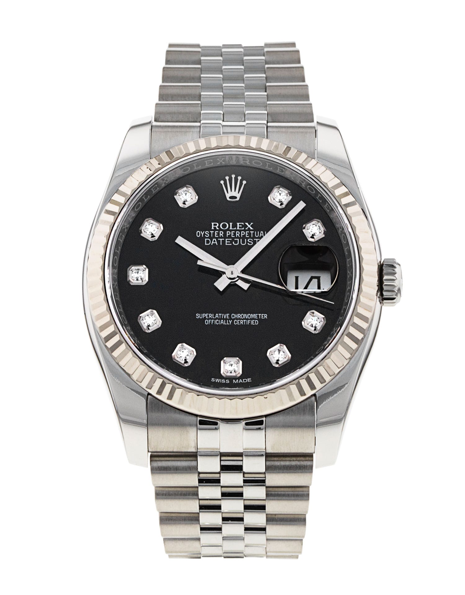 This Rolex Datejust 116234 has a black diamond dial and a bracelet strap. This Rolex has undergone a thorough inspection of water resistance, accuracy, functionality and condition to determine the level of reconditioning required to meet our strict standards. It has also been referenced against technical documents and manufacturer records where available to ensure authenticity and a clean history. All our watches have a 24-month warranty for your peace of mind. One of our skilled polishing technicians has removed marks on the case and bracelet of this watch, brought about by daily wear and tear, which is why this watch does not come with the remaining manufacturer’s warranty.