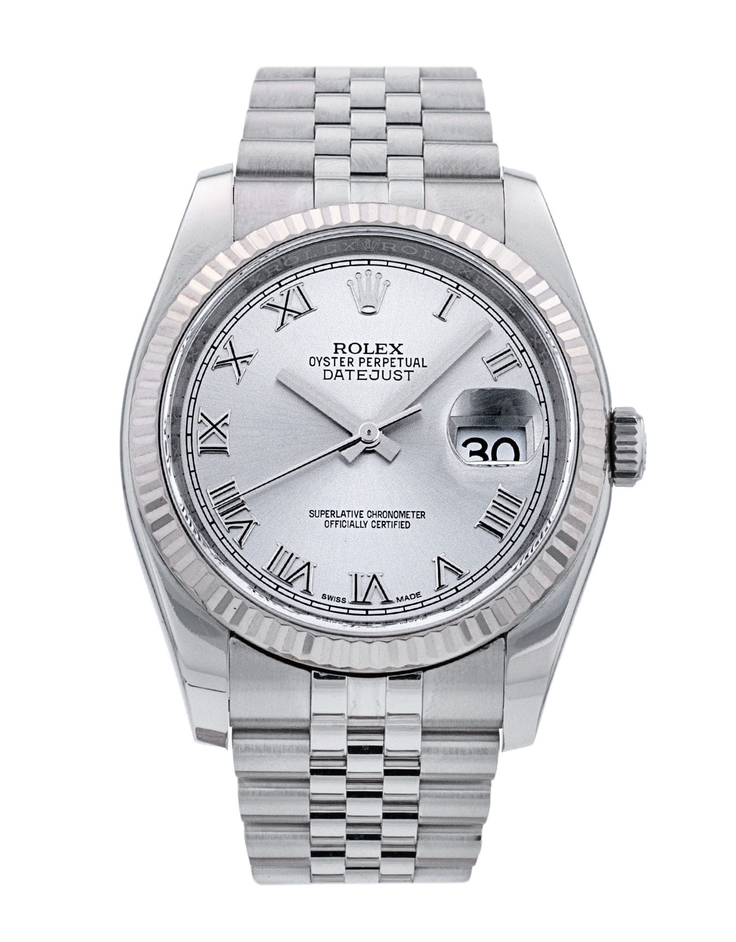 This Rolex Datejust 116234 has a rhodium roman numeral dial and a bracelet strap. This Rolex has undergone a thorough inspection of water resistance, accuracy, functionality and condition to determine the level of reconditioning required to meet our strict standards. It has also been referenced against technical documents and manufacturer records where available to ensure authenticity and a clean history. All our watches have a 24-month warranty for your peace of mind. One of our skilled polishing technicians has removed marks on the case and bracelet of this watch, brought about by daily wear and tear, which is why this watch does not come with the remaining manufacturer’s warranty.