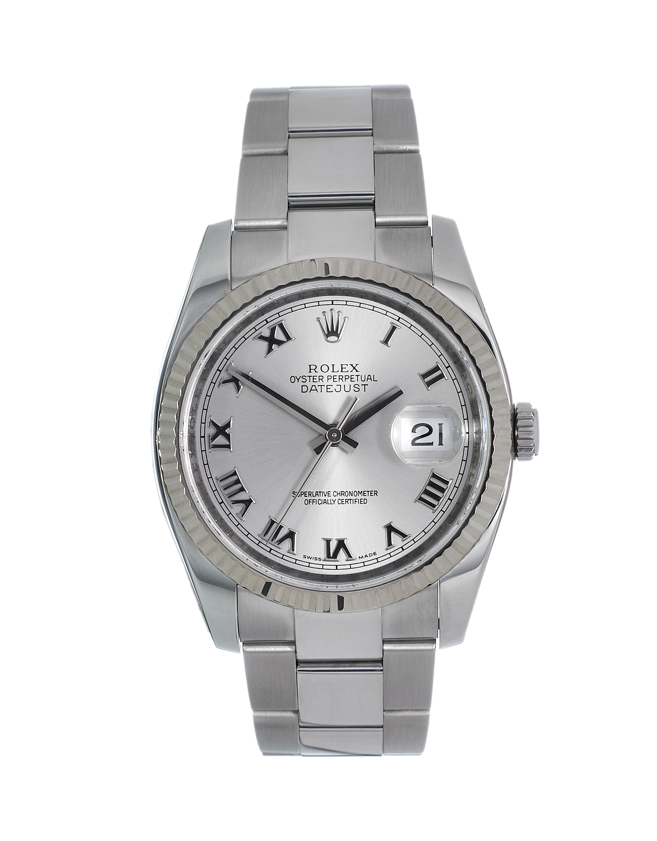 This Rolex Datejust 116234 has a silver roman numeral dial and a bracelet strap. This Rolex has undergone a thorough inspection of water resistance, accuracy, functionality and condition to determine the level of reconditioning required to meet our strict standards. It has also been referenced against technical documents and manufacturer records where available to ensure authenticity and a clean history. All our watches have a 24-month warranty for your peace of mind. One of our skilled polishing technicians has removed marks on the case and bracelet of this watch, brought about by daily wear and tear, which is why this watch does not come with the remaining manufacturer’s warranty.