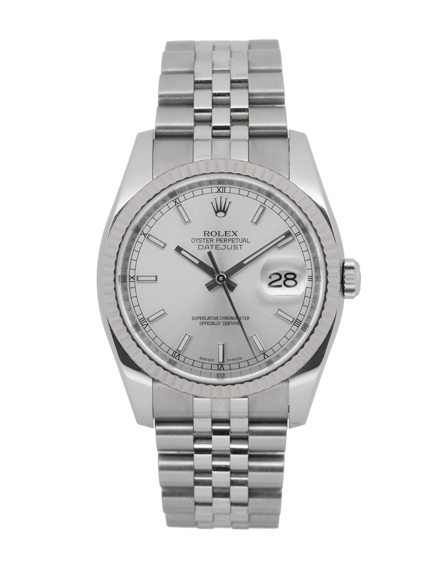This Rolex Datejust 116234 has a silver baton dial and a bracelet strap. This Rolex has undergone a thorough inspection of water resistance, accuracy, functionality and condition to determine the level of reconditioning required to meet our strict standards. It has also been referenced against technical documents and manufacturer records where available to ensure authenticity and a clean history. All our watches have a 24-month warranty for your peace of mind. One of our skilled polishing technicians has removed marks on the case and bracelet of this watch, brought about by daily wear and tear, which is why this watch does not come with the remaining manufacturer’s warranty.