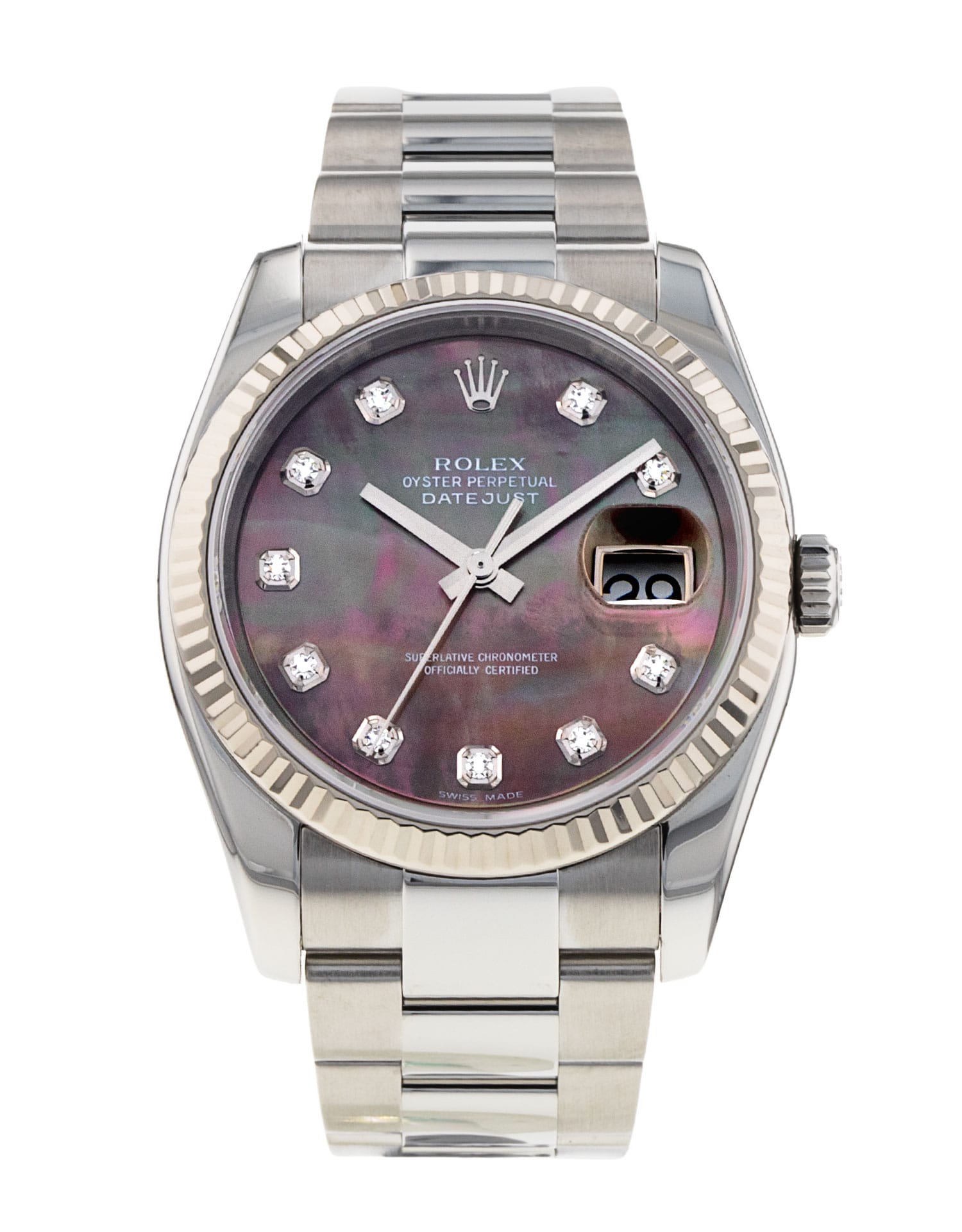 This Rolex Datejust 116234 has a mother of pearl - black - diamond dial and a bracelet strap. This Rolex has undergone a thorough inspection of water resistance, accuracy, functionality and condition to determine the level of reconditioning required to meet our strict standards. It has also been referenced against technical documents and manufacturer records where available to ensure authenticity and a clean history. All our watches have a 24-month warranty for your peace of mind. One of our skilled polishing technicians has removed marks on the case and bracelet of this watch, brought about by daily wear and tear, which is why this watch does not come with the remaining manufacturer’s warranty.
