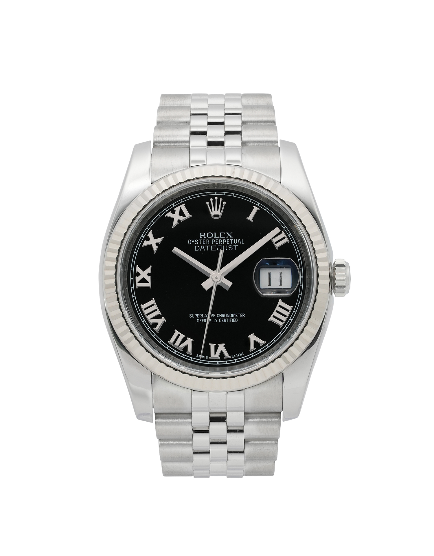 This Rolex Datejust 116234 has a black roman numeral dial and a bracelet strap. This Rolex has undergone a thorough inspection of water resistance, accuracy, functionality and condition to determine the level of reconditioning required to meet our strict standards. It has also been referenced against technical documents and manufacturer records where available to ensure authenticity and a clean history. All our watches have a 24-month warranty for your peace of mind. One of our skilled polishing technicians has removed marks on the case and bracelet of this watch, brought about by daily wear and tear, which is why this watch does not come with the remaining manufacturer’s warranty.