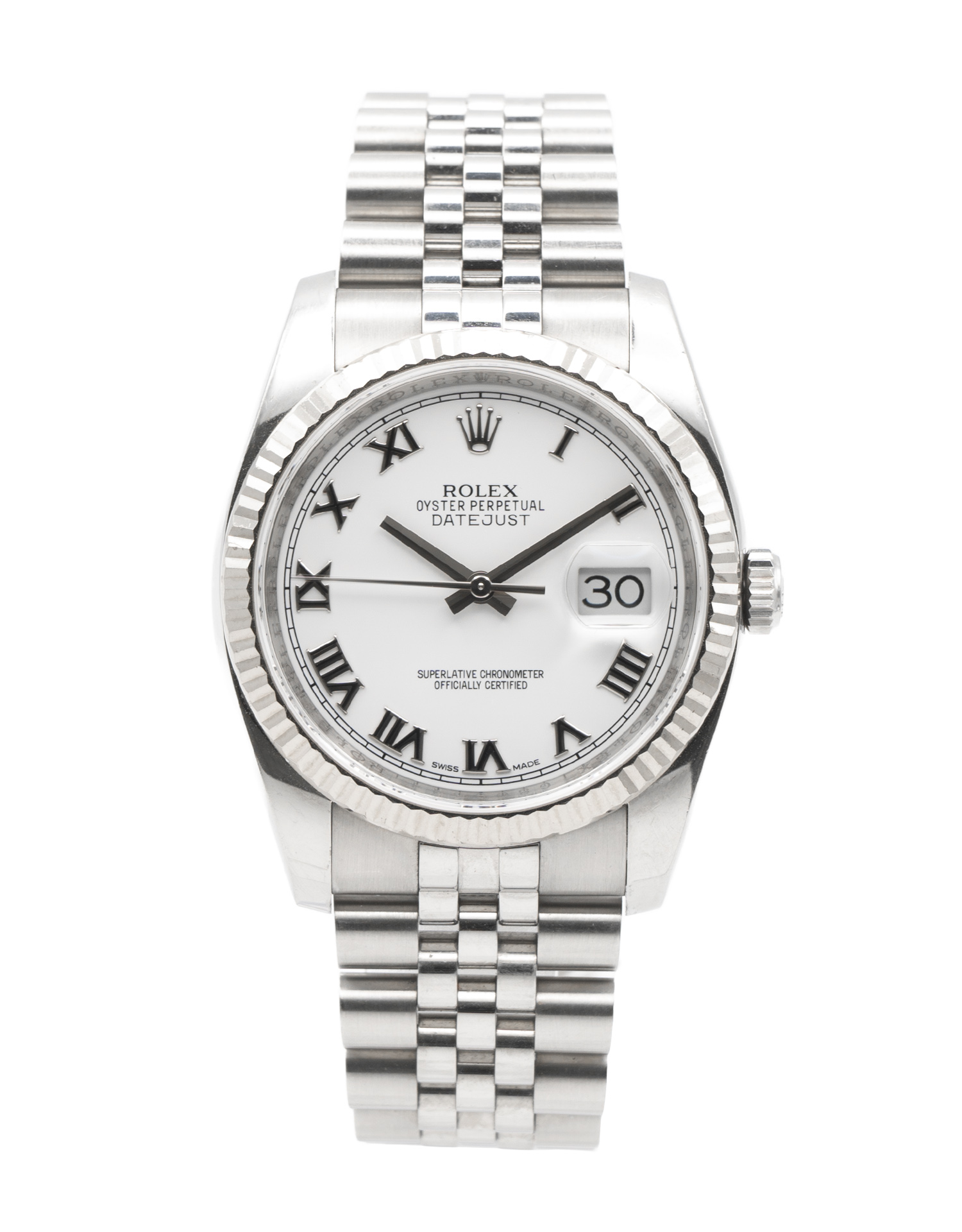 This Rolex Datejust 116234 has a white roman numeral dial and a bracelet strap. This Rolex has undergone a thorough inspection of water resistance, accuracy, functionality and condition to determine the level of reconditioning required to meet our strict standards. It has also been referenced against technical documents and manufacturer records where available to ensure authenticity and a clean history. All our watches have a 24-month warranty for your peace of mind. One of our skilled polishing technicians has removed marks on the case and bracelet of this watch, brought about by daily wear and tear, which is why this watch does not come with the remaining manufacturer’s warranty.