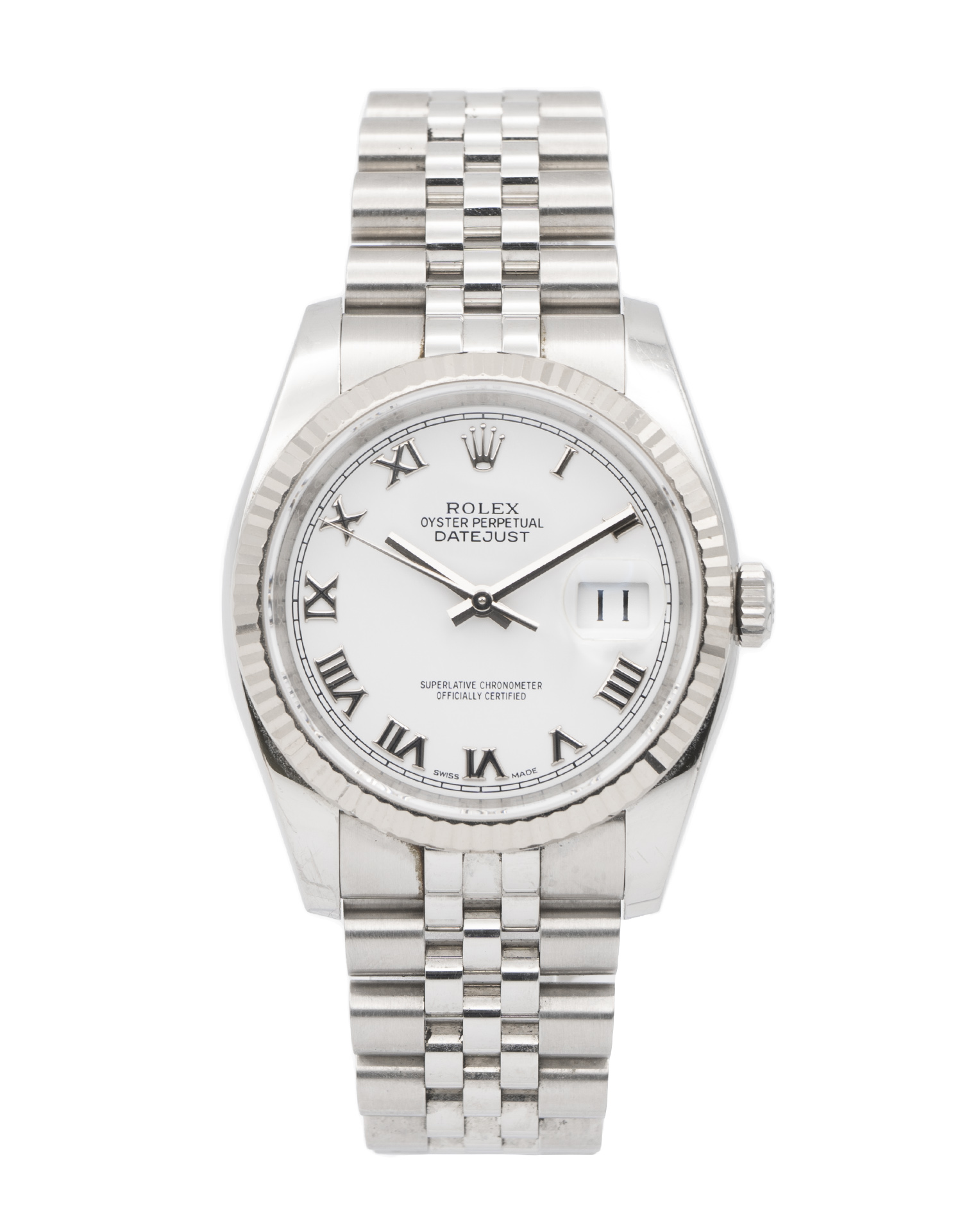 This Rolex Datejust 116234 has a white roman numeral dial and a bracelet strap. This Rolex has undergone a thorough inspection of water resistance, accuracy, functionality and condition to determine the level of reconditioning required to meet our strict standards. It has also been referenced against technical documents and manufacturer records where available to ensure authenticity and a clean history. All our watches have a 24-month warranty for your peace of mind. One of our skilled polishing technicians has removed marks on the case and bracelet of this watch, brought about by daily wear and tear, which is why this watch does not come with the remaining manufacturer’s warranty.