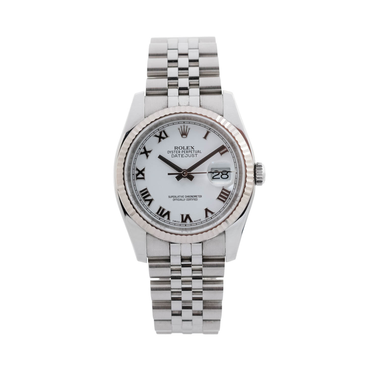 This Rolex Datejust 116234 has a white roman numeral dial and a bracelet strap. This Rolex has undergone a thorough inspection of water resistance, accuracy, functionality and condition to determine the level of reconditioning required to meet our strict standards. It has also been referenced against technical documents and manufacturer records where available to ensure authenticity and a clean history. All our watches have a 24-month warranty for your peace of mind. One of our skilled polishing technicians has removed marks on the case and bracelet of this watch, brought about by daily wear and tear, which is why this watch does not come with the remaining manufacturer’s warranty.